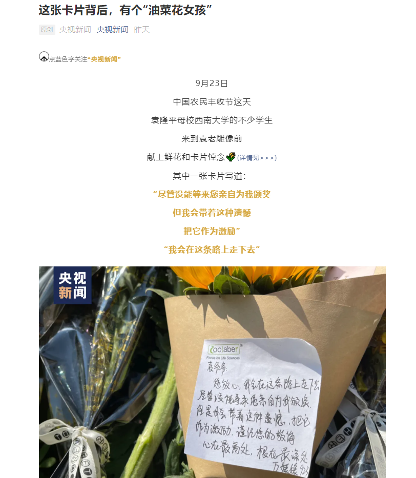 继全网连续报道学校丰收节深切缅怀袁隆平院士后,央视新闻微信公众号头条9月25日以《这张卡片背后,有个“油菜花女孩”》为题,光明日报9月24日7版以《愿做一颗种子,遇雨则生,不惧冬雪》为题,进一步走进袁隆平母院,挖掘学校青年学子背后的故事,深入报道青年学子秉承袁隆平毕生追求与理想,深耕农学专业,坚定理想信念,勇扛使命担当的主流强音。国家级媒体的持续发声,再次展现了学校农学专业矢志劝课农桑,坚持科技强农,着力培养农业现代化领跑者,奋力加快农业农村现代化建设的社会担当。以下为报道全文: