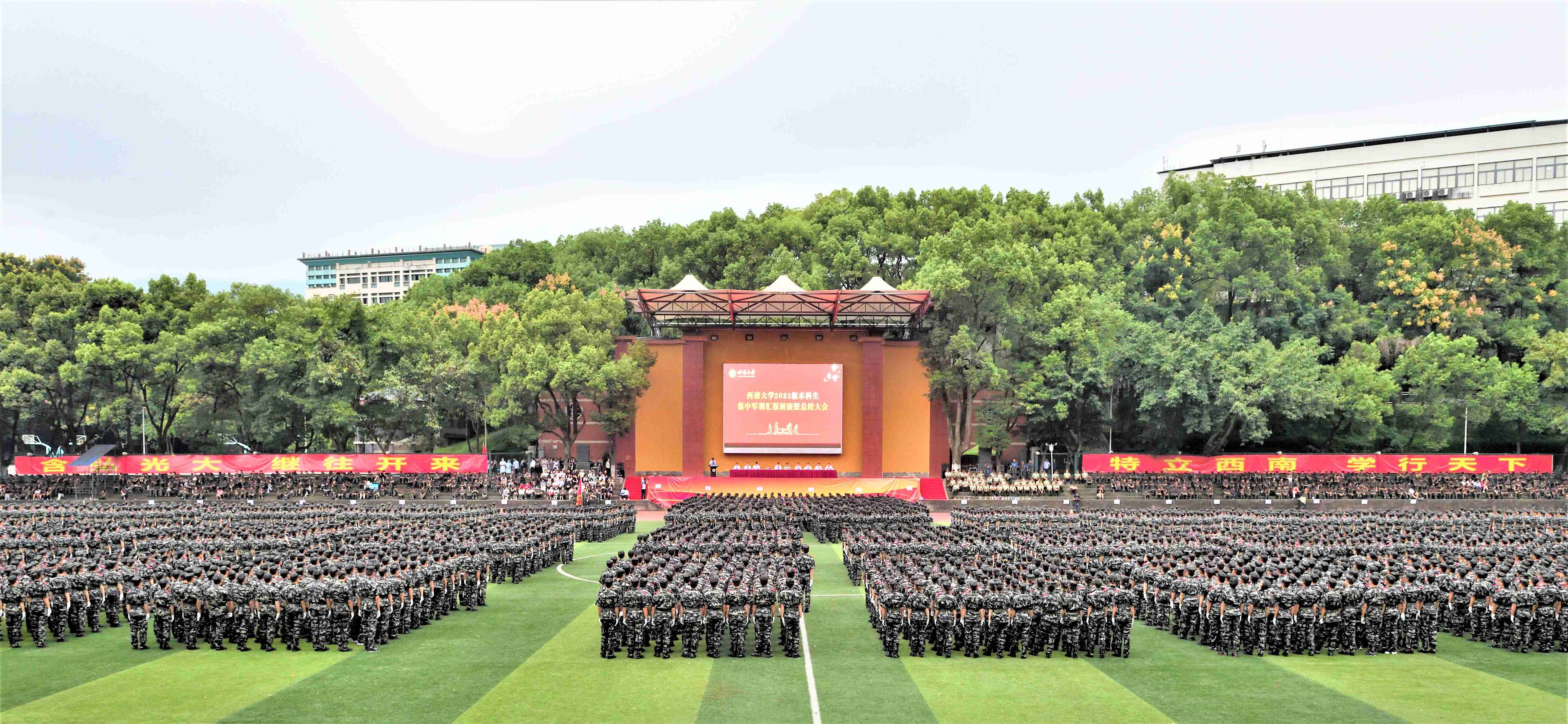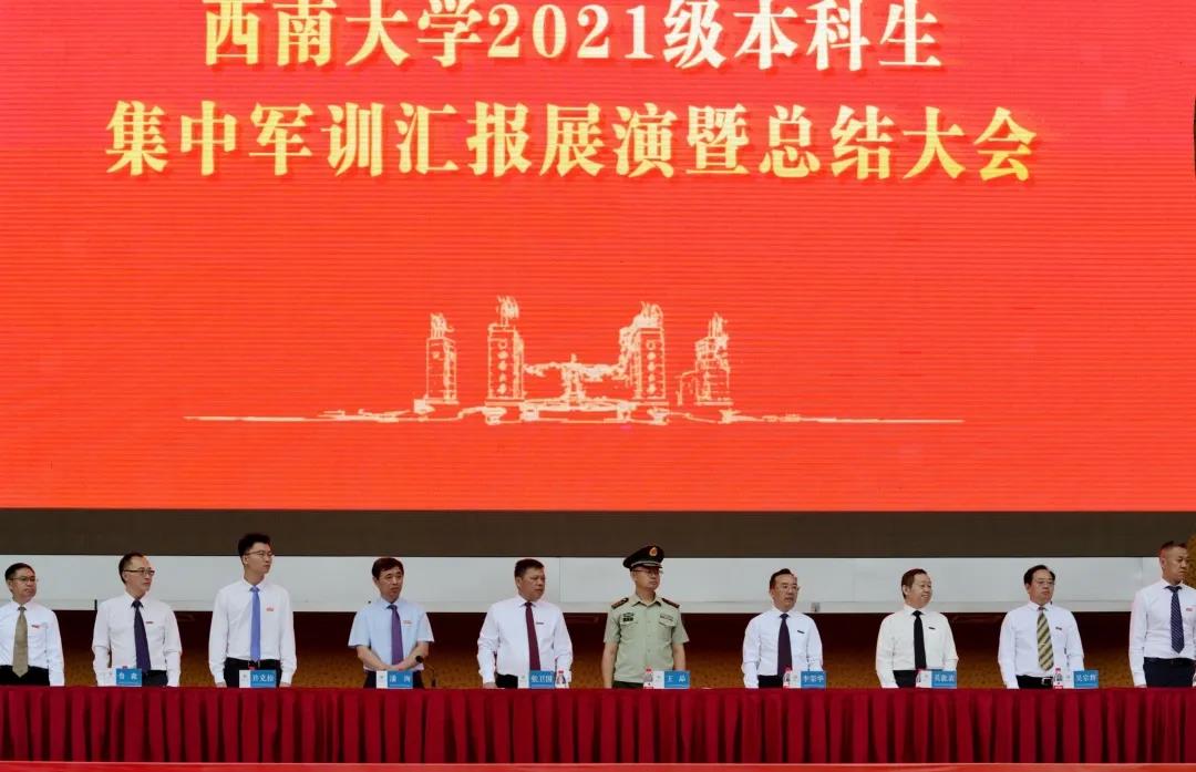拳拳报国志,沙场秋点兵。9月27日上午,学校2021级本科生军训汇报展演暨总结大会在北碚校区第一运动场和荣昌校区运动场同步举行。校长、军训领导小组组长、军训师师长张卫国,学校党委副书记安春元,学校党委副书记、军训领导小组副组长、军训师副政委潘洵出席活动,军训领导小组成员单位,承训部队全体教导员、各学院(部)参训干部,2021级全体本科生参加。