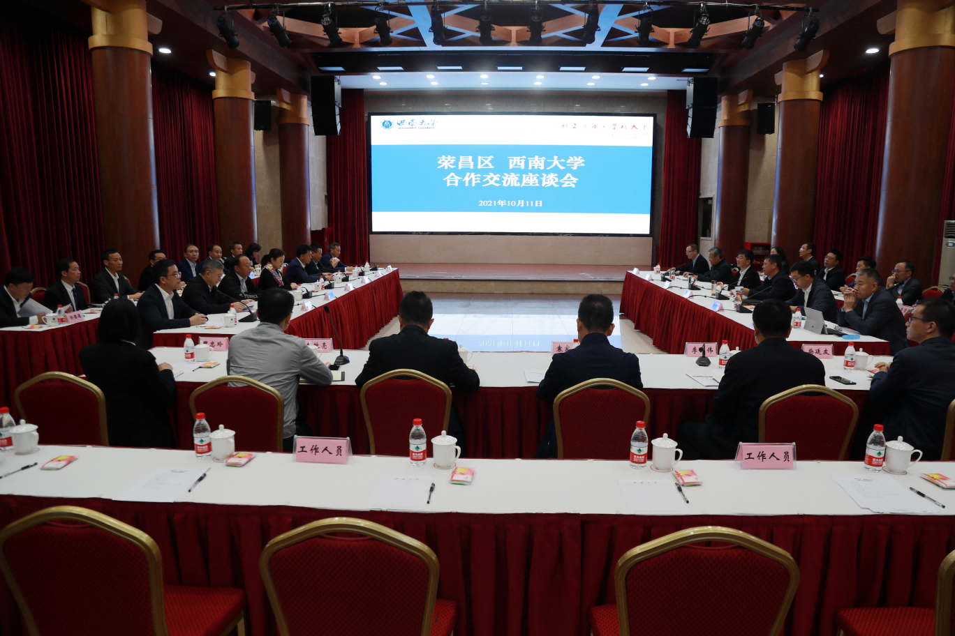 为深化校区合作,10月11日上午,荣昌区委书记卢红,区长高洪波,人大常委会主任艾亚军,政协主席陈震,区委常委、宣传部部长赵天智,区委常委、统战部部长秦启光,副区长程建林等来校考察交流,商讨校区合作。双方举行合作交流座谈会,学校党委书记李旭锋、校长张卫国、党委副书记安春元、副校长赵国华出席座谈会,校区双方有关部门负责人参加会议,赵国华主持会议。