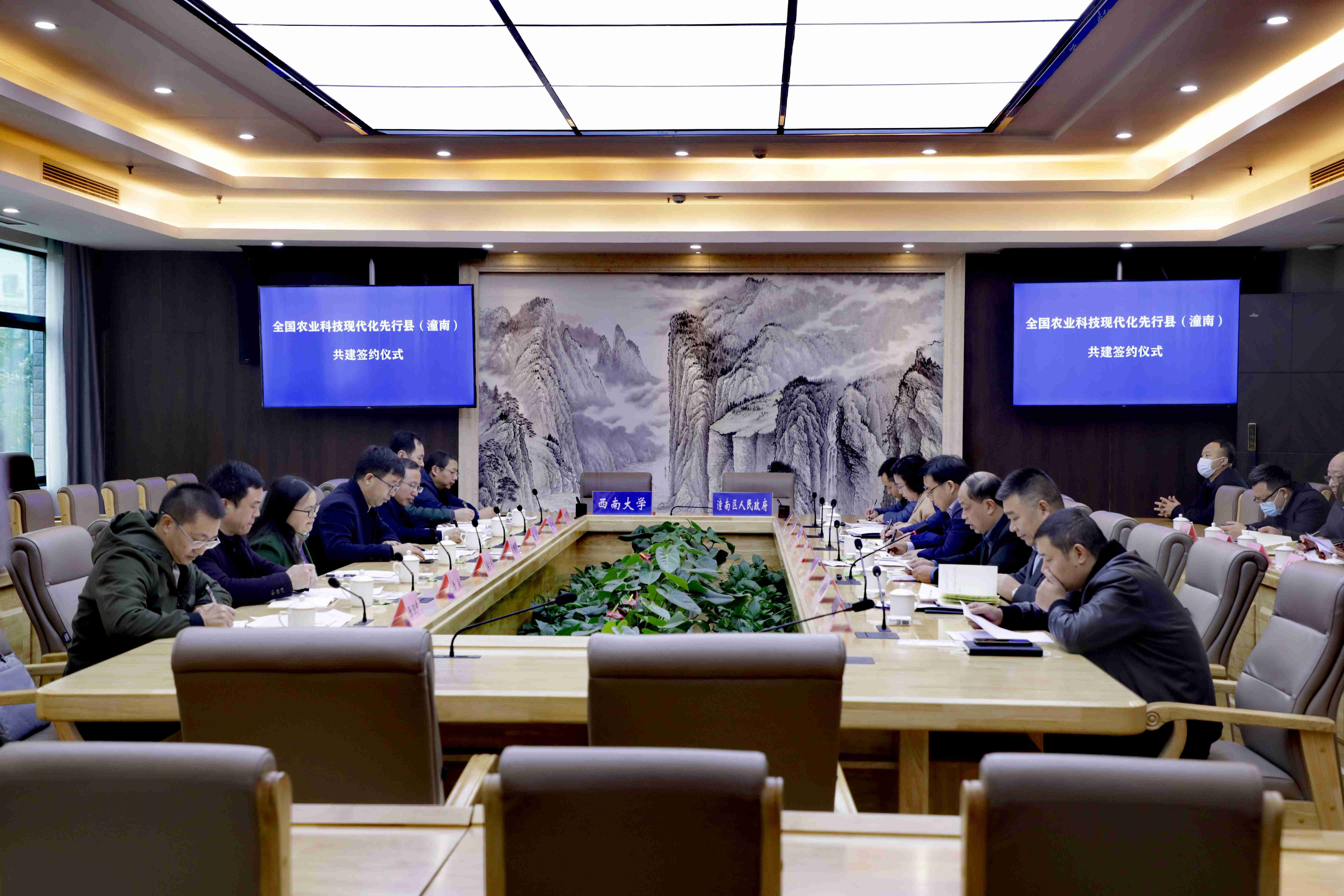 会议通报全国农业科技现代化先行县共建工作前期推进情况,审议并通过共建方案。赵国华和罗全良代表校地双方签署《潼南区人民政府·Beat365中国唯一官方网站共建全国农业科技现代化先行县合作协议》。协议约定,“十四五”期间,区校双方将围绕全国农业科技现代化先行县创建总体要求,在农业关键技术攻关、农科教协同创新基地建设、智慧农业试验区建设、农业技术创新与服务平台建设、生态宜居乡村建设、新型经营主体培育、产业人才培养等方面开展深入合作,努力探索形成高校科技支撑县域经济发展、服务乡村振兴的新模式。