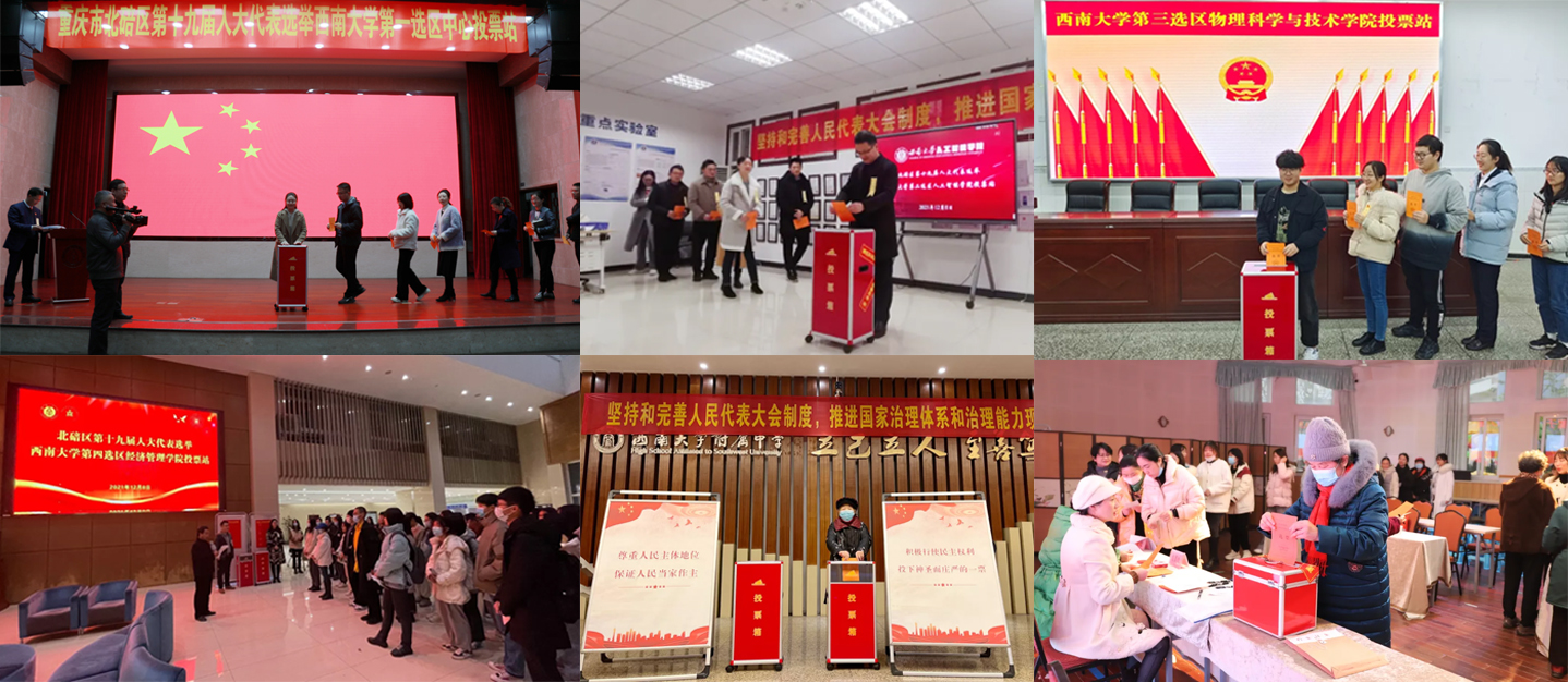 本次选举,学校总计分设五个选区,共登记选民56650人。根据相关文件要求,学校应选举产生北碚区第十九届人民代表大会代表11名,经推荐、提名、酝酿等程序确定了正式代表候选人16名。