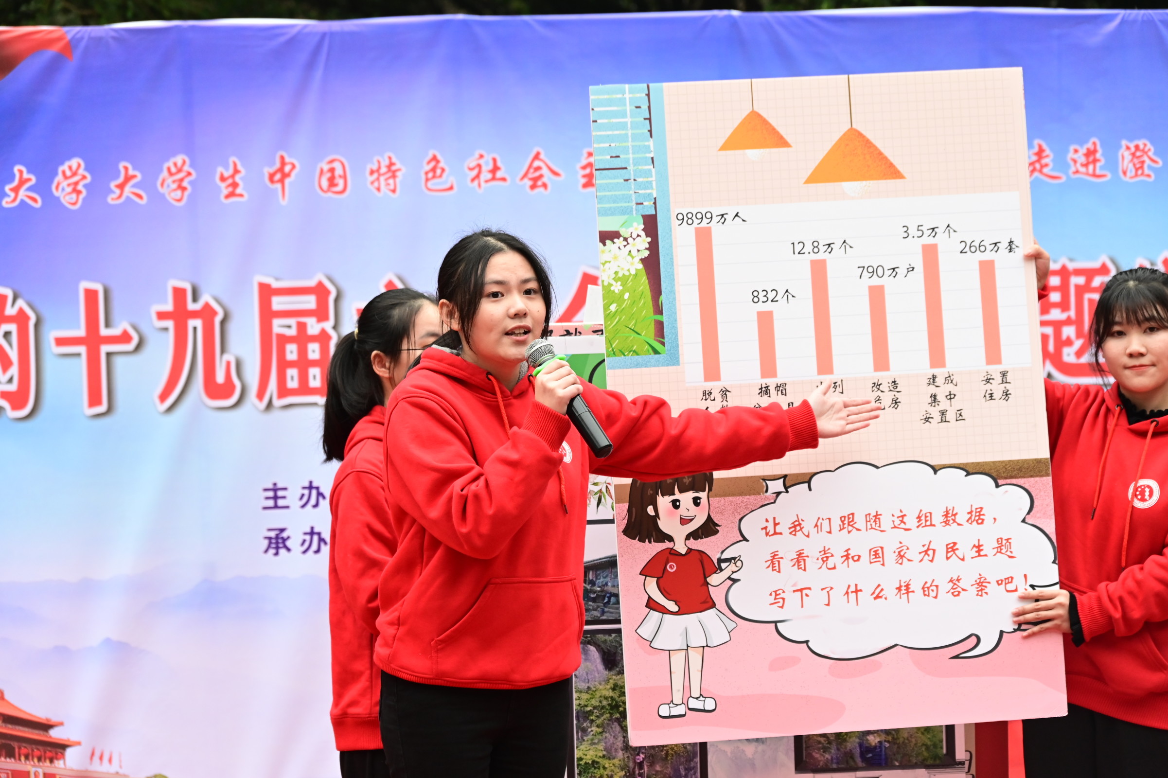 12月10日下午,学校大学生中国特色社会主义理论体系宣讲团走进重庆市北碚区澄江镇,为镇上近百名群众宣讲党的十九届六中全会精神。宣讲员们用生动活泼的快板舞和图说18张党的十九届六中全会精神的原创漫画,带来了这场兼具知识性与趣味性的宣讲活动。