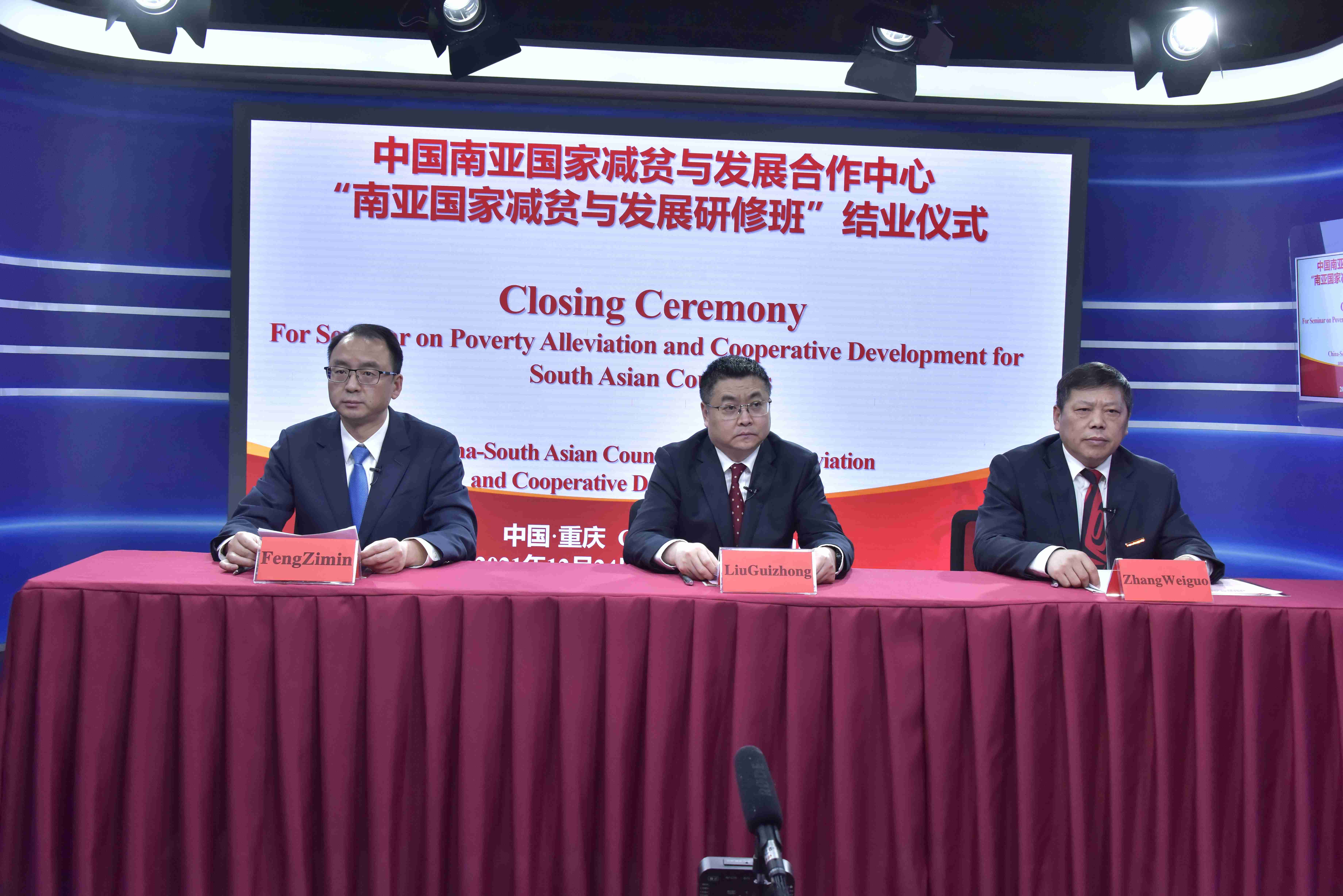 12月24日,中国南亚国家减贫与发展合作中心“南亚国家减贫与发展研修班”在学校举办线上结业仪式,重庆市乡村振兴局局长刘贵忠、重庆市政府外办副主任冯子敏、Beat365中国唯一官方网站校长张卫国出席结业仪式。来自阿富汗、巴基斯坦、尼泊尔、斯里兰卡、孟加拉国五国涉及发展、减贫、农业、经济和国际合作等领域的相关部门官员共计55名学员完成学习内容,经考核合格,准予结业。