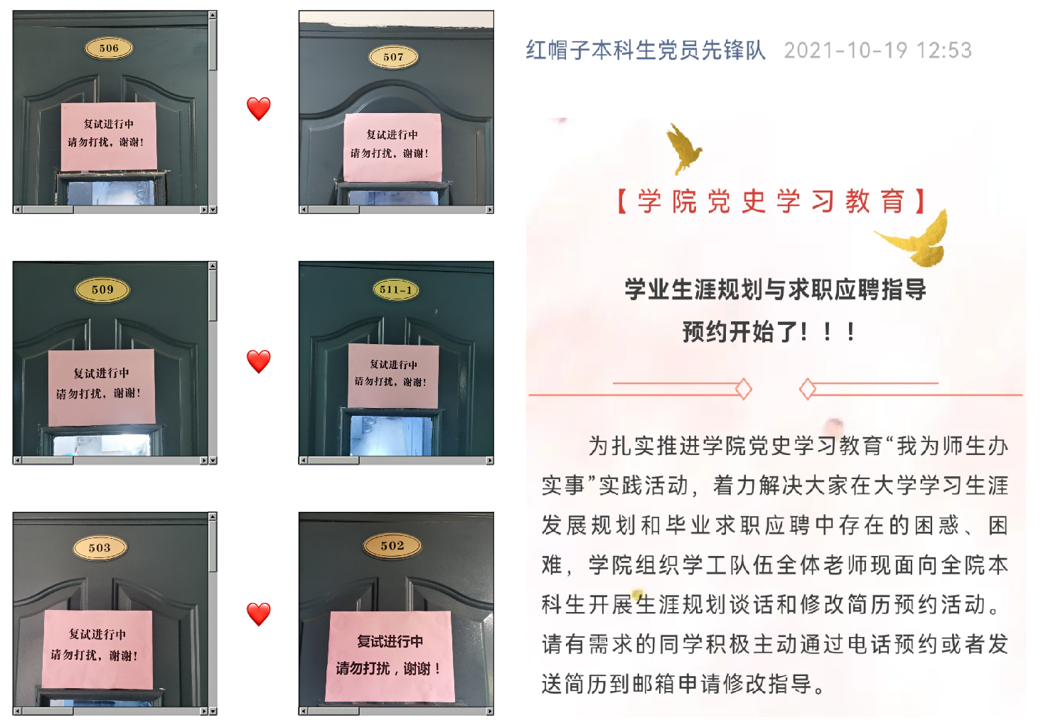 提早部署,全力营造就业氛围。通过及时召开毕业生就业动员会、考研就业指导暨实习工作动员会等,在全体毕业生中营造就业氛围。建立学院党政联席会成员一对一联系本科生班级、副书记担任毕业班级班主任的工作机制,多渠道推动“靠前指挥”落地落实。打造“教授下午茶”等活动品牌,多角度吸引研究生导师、专业教师更广泛参与学生职业规划和就业指导工作,形成全院参与就业工作局面。