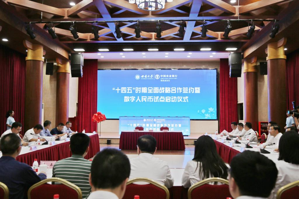校银携手再合作“智慧校园”新篇章。5月10日,学校与农业银行重庆市分行“十四五”时期战略合作协议签约仪式在东方红会议厅成功举办,双方启动数字人民币校园试点。农业银行重庆市分行行长王全刚,副行长杨秀明、姜栋林、罗波;学校校长张卫国,党委副书记潘洵,副校长赵国华、韩旭东出席签约仪式。