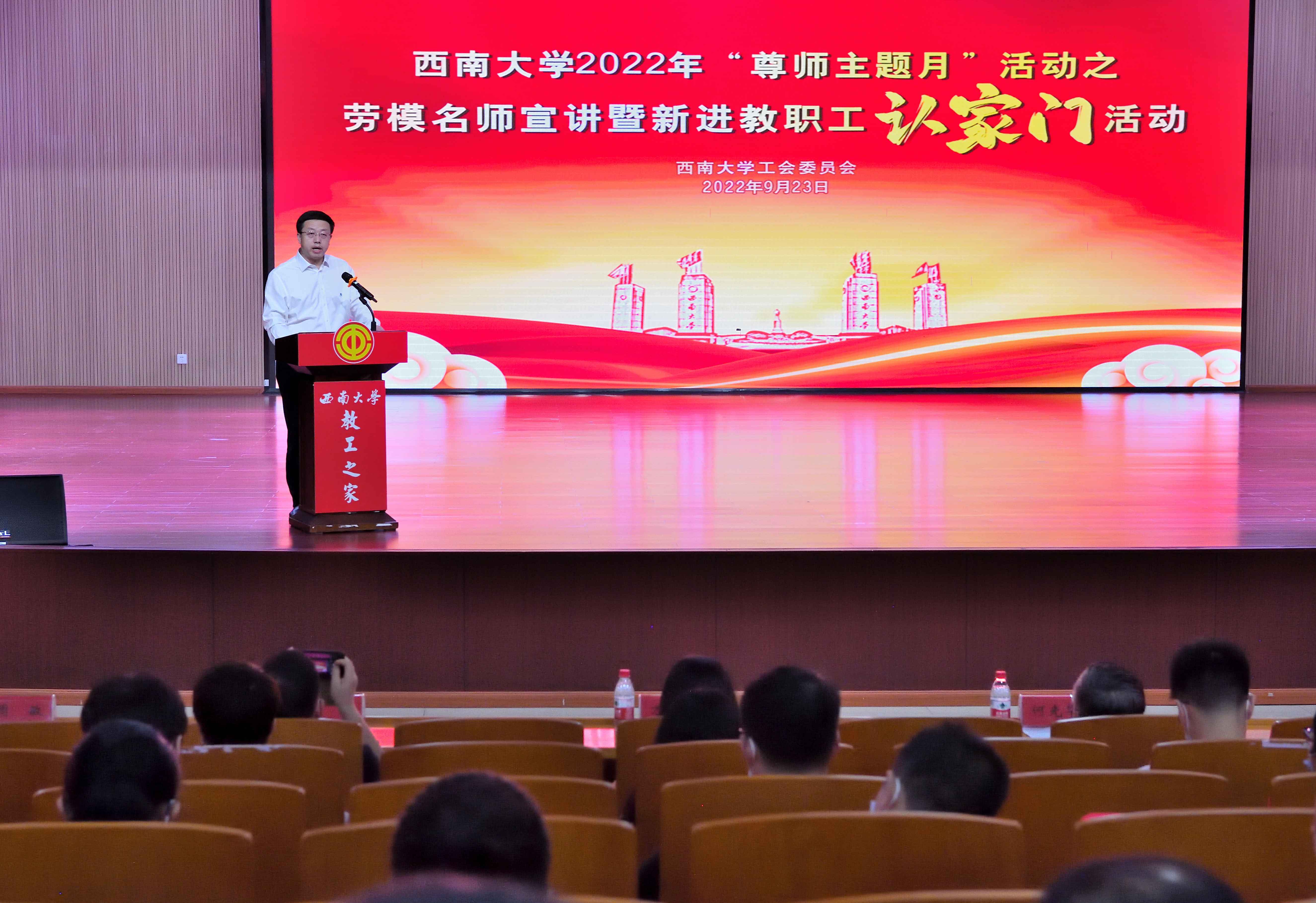 9月23日下午,校工会在学校圆顶三楼报告厅举办“立德树人担使命 青春建功新时代”为主题的劳模名师宣讲暨新进教职工认家门活动,该活动属于学校2022年“尊师主题月”系列活动。学校党委副书记、纪委书记夏玉峰出席活动,部分职能部门和学院相关负责人、各二级单位工会主席以及2022年新进教职工200余人参加活动。