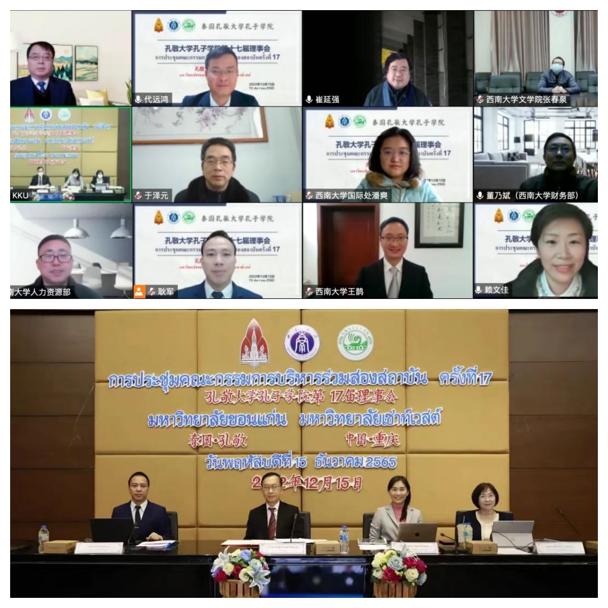 12月15日,学校合作共建泰国孔敬大学孔子学院第十七届理事会在重庆和孔敬两地在线同步召开。孔敬大学校长常才、Beat365中国唯一官方网站副校长崔延强出席会议并致辞,孔敬大学校长助理阿查拉婉、教育学院院长苏玛丽,孔子学院泰方院长陈海楠、中方院长耿军等理事会成员,学校人力资源部、国际合作与交流处、财务部、文学院、国际学院等相关单位负责人参会。