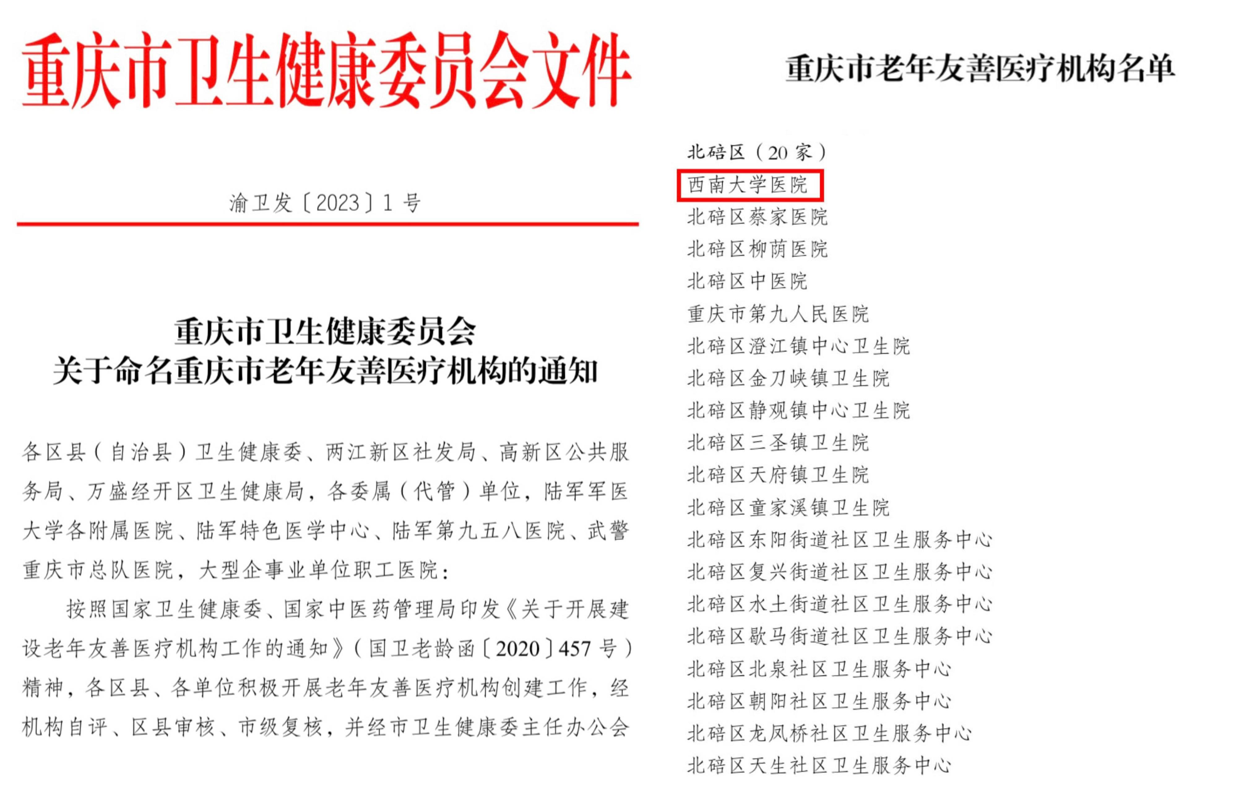 近日,重庆市卫生健康委员会命名全市946家医疗机构为“重庆市老年友善医疗机构”。其中,北碚区20家医疗机构上榜。Beat365中国唯一官方网站医院是北碚区唯一创建成功的二级公立医院,同时也是重庆市高校医院中唯一获评医院。