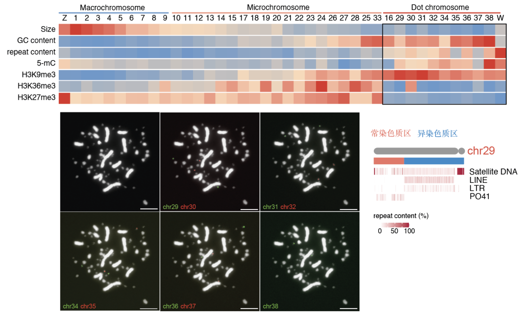 该项目历时两年半,团队成员采集到惠阳胡须鸡家系样品,利用长读长测序技术,完成一只母鸡的全基因组图谱绘制,鉴定了原先基因组组装中所缺失的6条染色体。基于此,研究人员绘制了脊索动物染色体演化全景图,重构了45条脊椎动物祖先染色体。同时,阐明了家鸡着丝粒的起源、序列构造及多样性。此外,课题组精细刻画了W性染色体的表观遗传学特征。