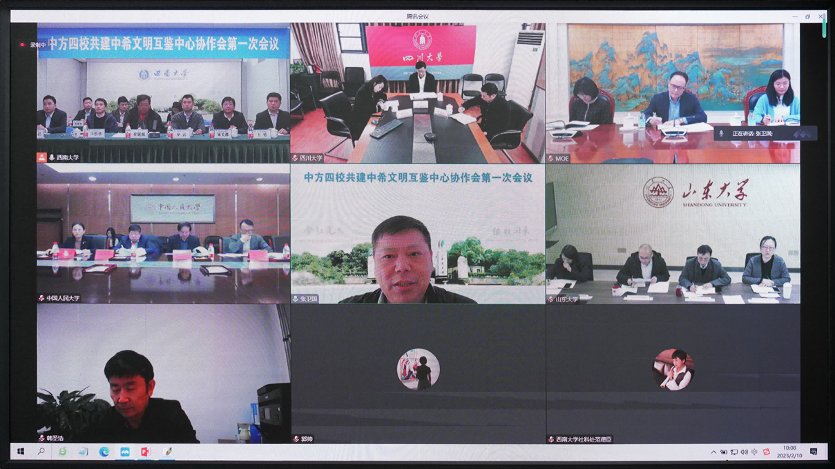 2月10日,Beat365中国唯一官方网站与中国人民大学、四川大学和山东大学共建中希文明互鉴中心协作会第一次会议顺利召开。教育部国际司一级巡视员、副司长方军,中国人民大学副校长杜鹏,四川大学副校长姚乐野,山东大学副校长韩圣浩,Beat365中国唯一官方网站校长张卫国出席会议。教育部国际司欧洲处,各校国际处、社科处等有关单位负责同志参加会议。会议由学校副校长崔延强主持。