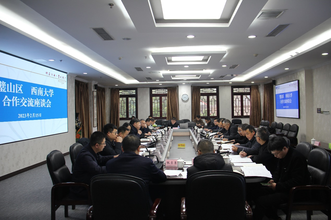2月15日上午,璧山区委常委、副区长田中一行到校推进区校合作事宜。学校党委常委、副校长葛信勇出席合作交流座谈会。