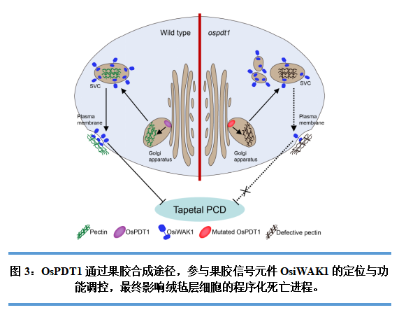 2022年4月19日,Plant Physiology(IF2021=8.005) 在线发表了学校水稻研究所的最新研究成果“OsPDT1通过果胶介导的信号通路影响水稻花药发育”(Oryza sativa PECTIN DEFECTIVE TAPETUM1affects anther development through a pectin-mediated signaling pathway in rice)。该研究以果胶合成相关的半乳糖醛酸基转移酶突变体oryza sativa pectin defective tapetum1(ospdt1)为研究对象,发现它的绒毡层细胞程序性死亡(PCD)提前,并产生了完全败育的花粉粒。与其它发生果胶缺陷的突变体不同,ospdt1突变体的果胶含量与野生型差异较小,起结构支撑作用的细胞壁果胶没有明显的缺陷。进一步研究发现WAK家族蛋白OsiWAK1在ospdt1突变体细胞内的分布受到了影响,OsiWAK1的敲除植株与ospdt1突变体出现了相似的绒毡层PCD提前,在ospdt1背景的水稻中超表达OsiWAK1部分恢复了ospdt1的缺陷。因此,该研究认为ospdt1突变体中的果胶合成缺陷影响了OsiWAK1蛋白在细胞内与果胶的整合与运输,进而影响了其功能,并导致绒毡层PCD提前。这一发现为植物体内的果胶如何发挥其生物学功能提供了新的见解(图3)。