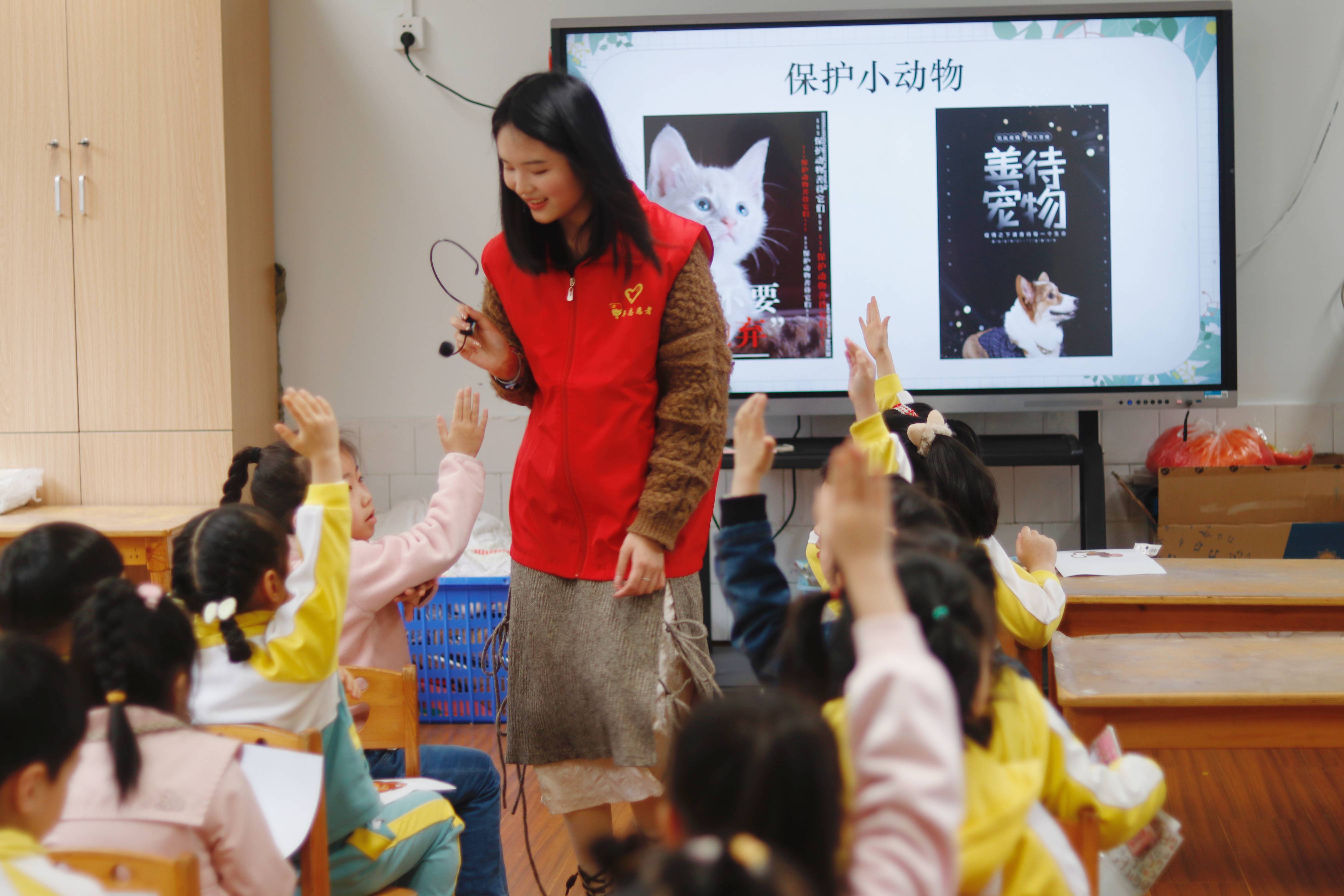 “鸵鸟为什么不会飞?”“狗狗为什么喜欢摇尾巴?”“为什么小鸭子走路摇摇晃晃?”活动中,志愿者们围绕“保护动物”“保护自己”等内容,通过视频科普、知识讲解、趣味问答、模仿游戏等形式,给孩子们上了一堂别开生面的“动物课”。小朋友们对讲解内容充满好奇,踊跃回答提问,现场气氛欢快热烈。
