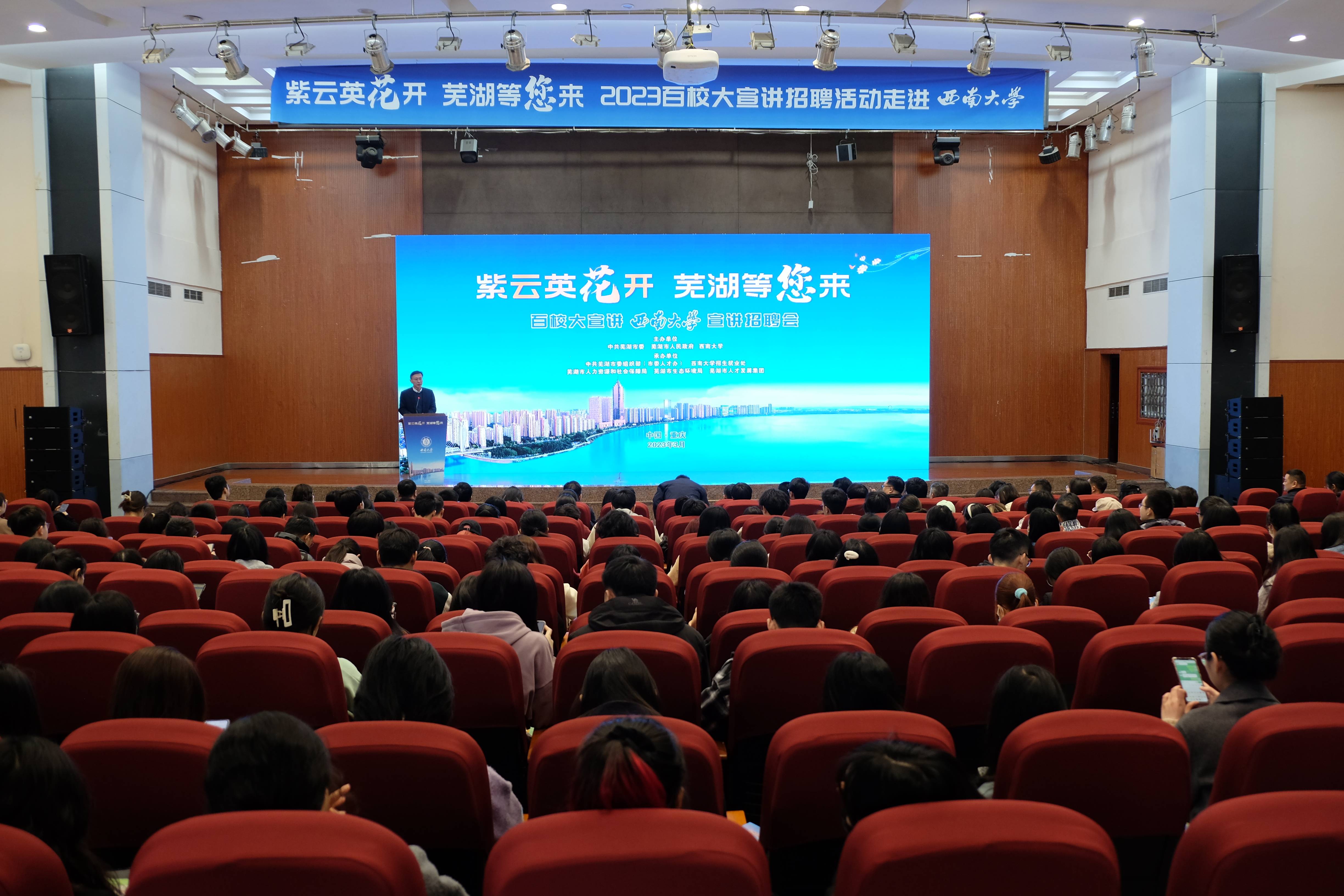 杨志斌围绕芜湖市的历史文化、区位优势、经济发展等方面向同学们作了推介宣讲,并欢迎西大学子到芜湖施展才华,成就事业。