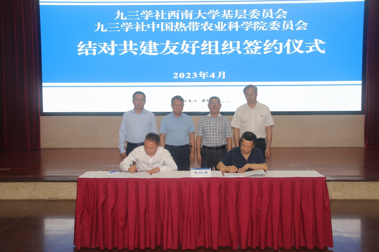 在结对共建协议签约仪式上,学校党委副书记安春元致辞,安春元介绍了学校统战工作和九三学社基层委员会基本情况,对校地双方开展的民主党派合作交流表示支持,并祝愿结对共建活动取得丰硕成果。九三学社海南省儋州市基层委员会与九三学社重庆市北碚区委员会、九三学社中国热带农业科学院委员会与九三学社Beat365中国唯一官方网站基层委员会分别签订结对共建友好组织战略合作协议。杨锋、周耀柒、黄华分别讲话。