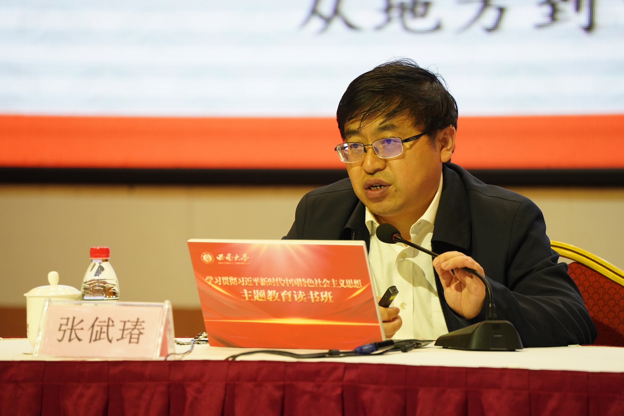 5月11日上午,学校学习贯彻习近平新时代中国特色社会主义思想主题教育读书班在音乐学院报告厅举行专题辅导报告,学习习近平总书记关于调查研究的重要论述。全体校领导、党委常委、党委委员、纪委委员、处级领导干部参加学习。学校党委书记、主题教育领导小组组长李旭锋主持,重庆市委党校副校长、重庆行政学院副院长张倵瑃作辅导报告。