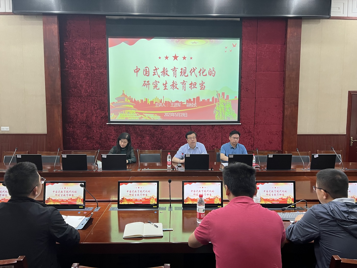 王进军带领大家回顾了中国共产党团结带领全国各族人民开展中国现代化建设的长期艰辛探索和实践,回顾了党的十八大以来我们党推进和拓展中国式现代化,全面推进中华民族伟大复兴的辉煌成就。结合党的二十大报告,系统梳理了教育现代化在中国式现代化中的重要作用以及教育现代化的发展路径。王进军强调,研究生教育是教育、科技、人才的汇聚性载体,肩负着高层次人才培养的光荣使命,研究生教育已经进入高质量发展的新阶段,我们要心怀“国之大者”,坚持“四个面向”,不断完善自主培养创新人才体系,以更好的适应新时代、新形势、新挑战。我们要坚持为党育人、为国育才,以加快培养国家急需的高层次人才为中心,以服务支撑经济社会高质量发展为导向,落实立德树人根本任务,加强导师队伍建设,全面深化改革,推进研究生教育治理现代化,努力建设好高质量研究生教育体系,为党和国家事业发展培养更多高层次人才,在全面建设社会主义现代化国家、全面推进中华民族伟大复兴的新征程上,作出新的更大贡献。