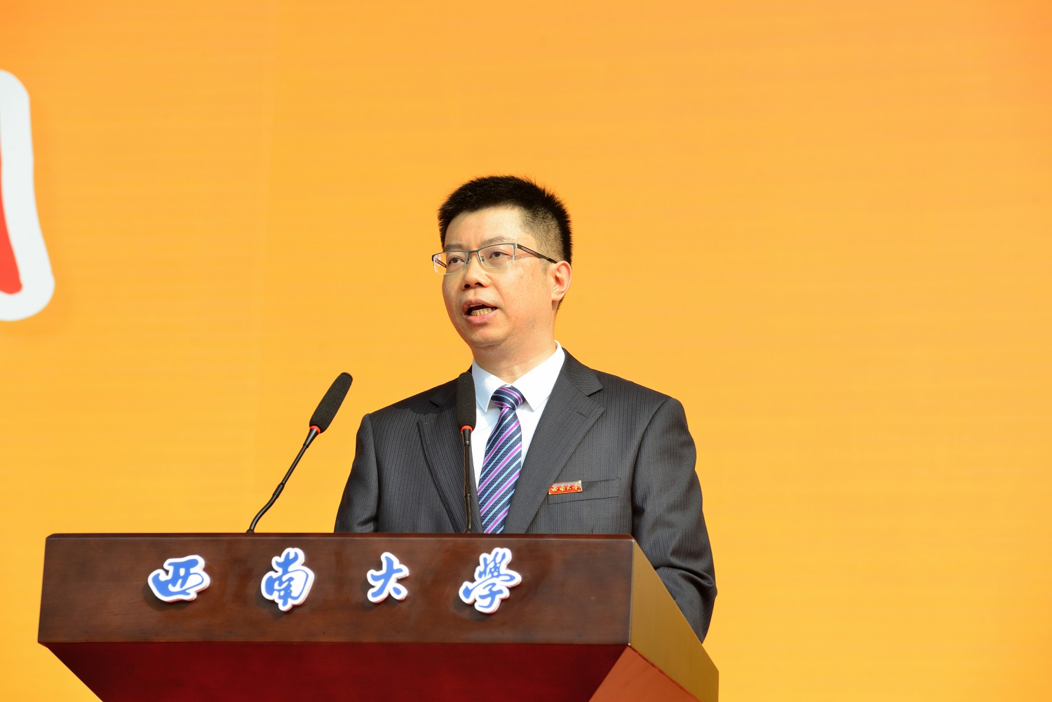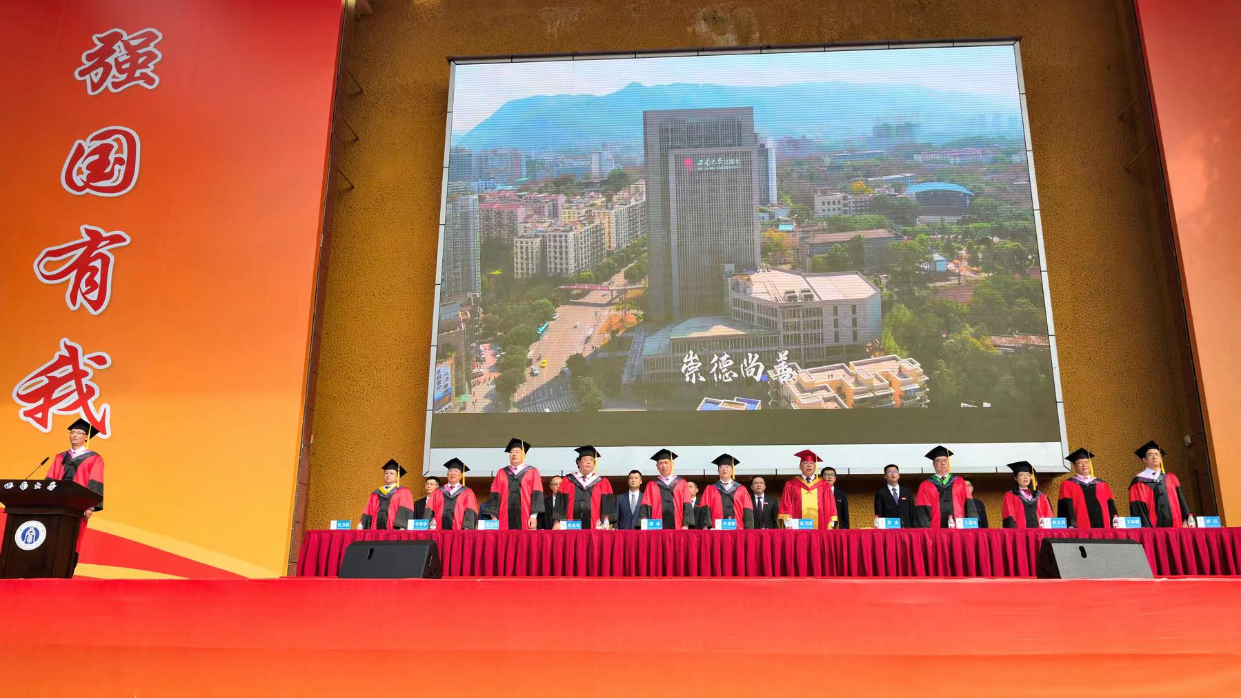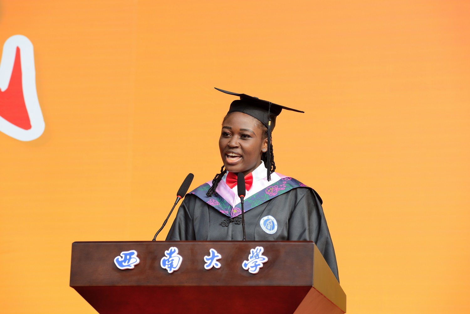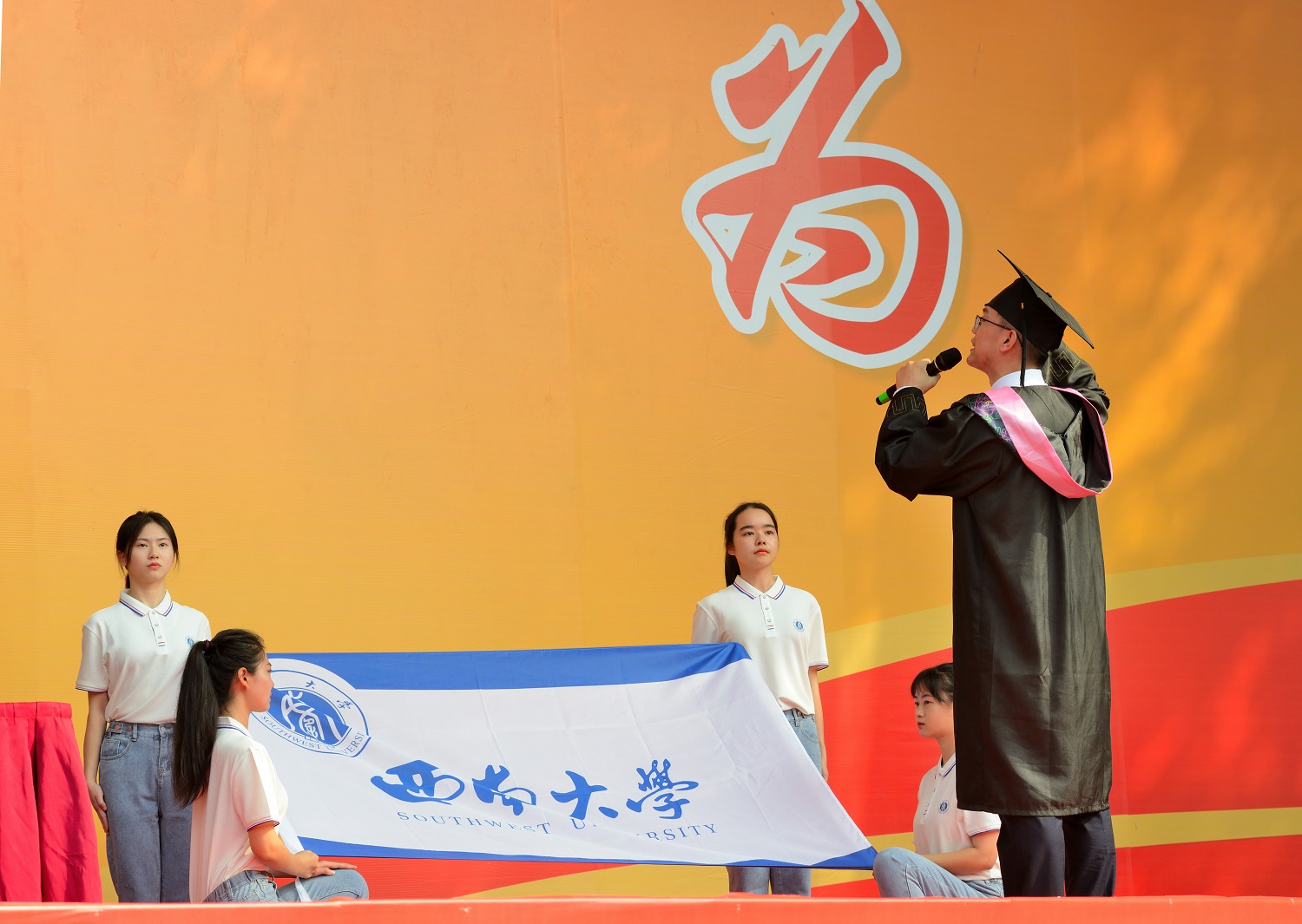 毕业生代表创新创业学院(含弘学院)胡云桐同学分享自己道阻且长、行而不辍的学习科研经历,号召同学们怀揣热爱、踔厉奋发,在时代浪潮中贡献青春力量,共续西大荣光。