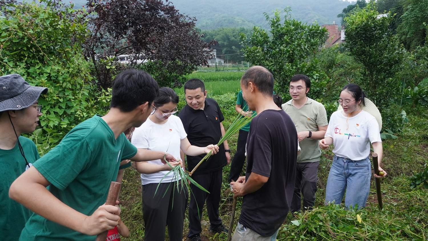 现场劳作,实践课堂开在田间地头。在长宁县竹海镇居民王友金家,服务团师生“自找苦吃”,化身“杂草克星”,帮助他们清除果园内的杂草。劳动过程中,随行教师还就水稻长势及病虫害防治情况与村民进行了交流,针对稻田秧苗和稗草特点进行了现场教学,与村民共同指导学生如何快速准确清除稻田稗草。劳动结束后,附近村民还拿出刚收割的蜂蜜请大家品尝,邀请学校师生再来指导。