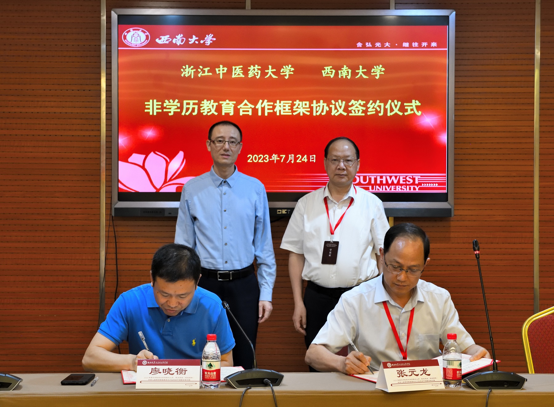 为进一步深化交流合作,提高干部、教师队伍综合素质能力,推进高等教育事业高质量发展,增强浙渝两地高校服务国家和地方经济社会建设发展,7月24日下午,浙江中医药大学与学校非学历教育合作协议在Beat365中国唯一官方网站举行签约仪式。浙江中医药大学党委书记黄文秀、党委副书记张元龙,学校党委副书记黄杰等领导出席此次签约仪式。党委宣传部 党委网络工作部部长,马克思主义学院党委书记廖晓衡主持开班仪式。