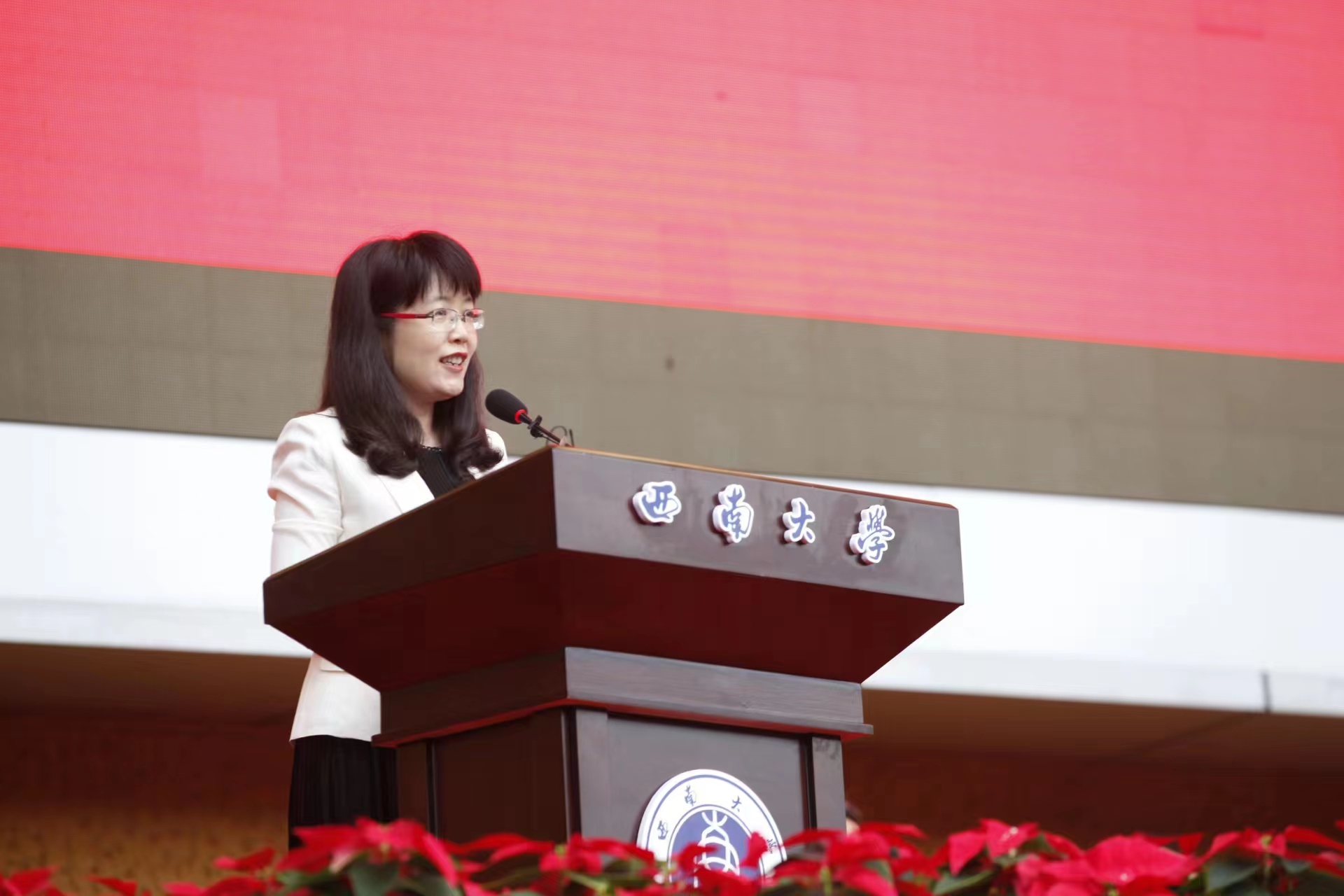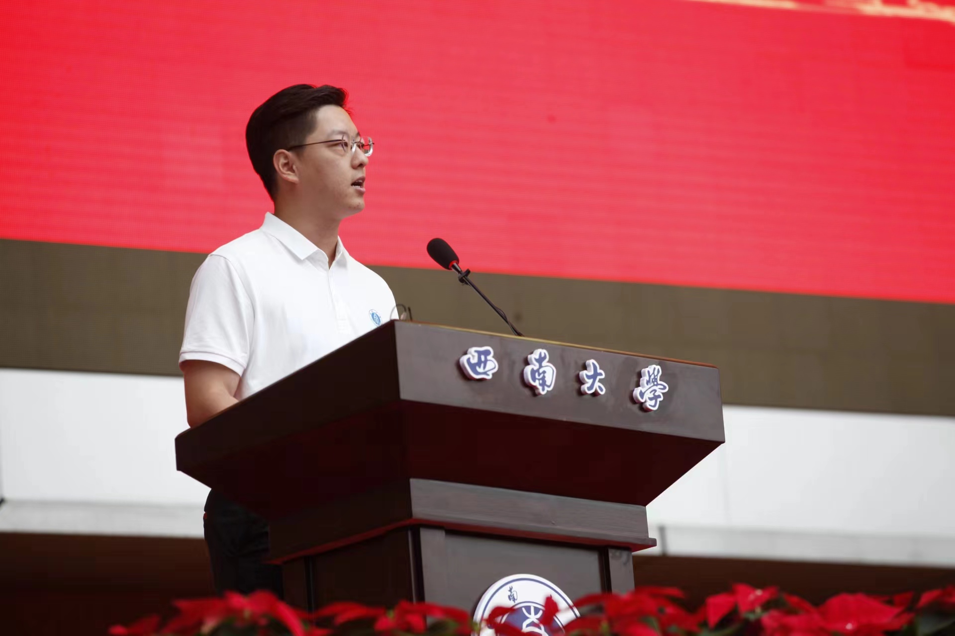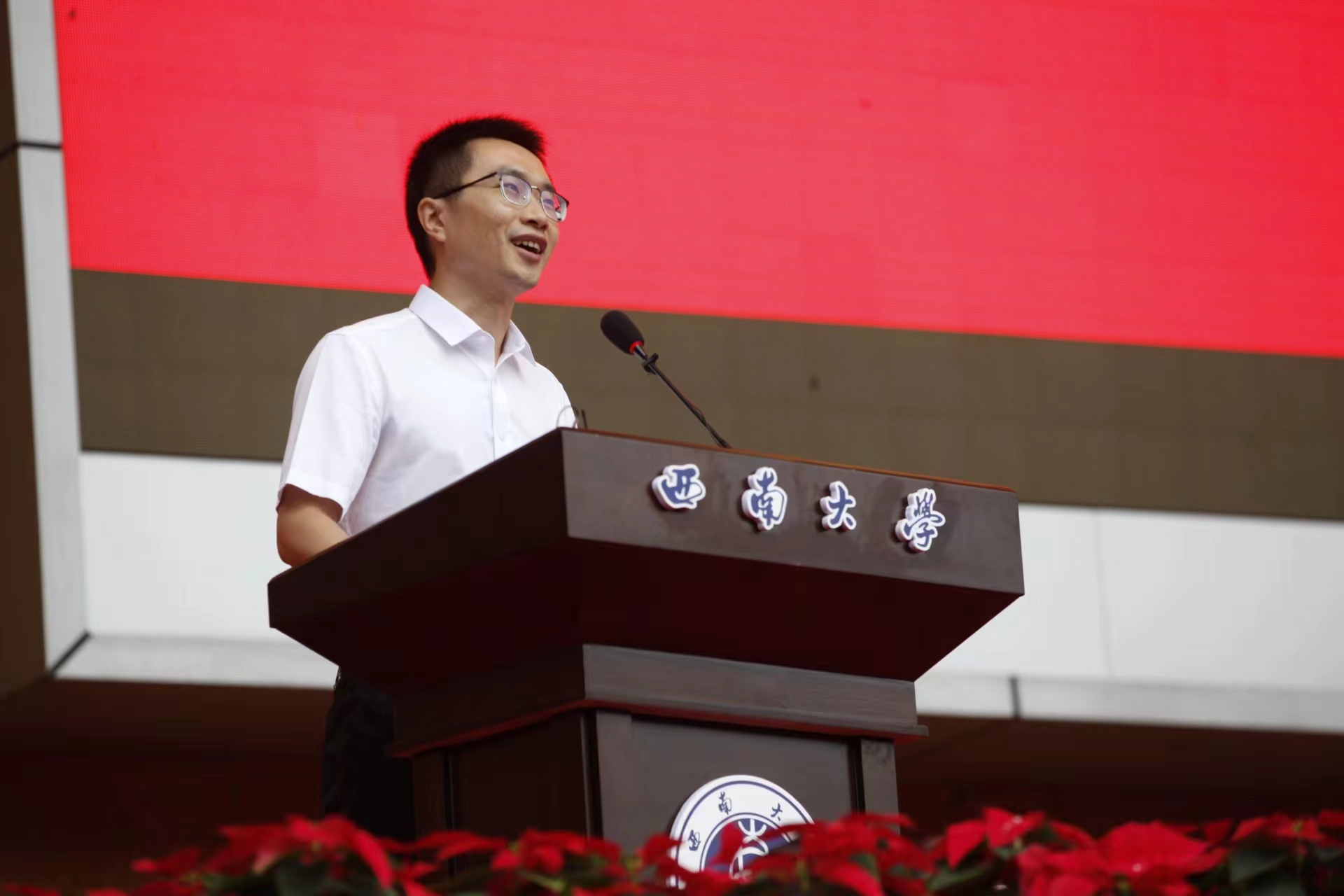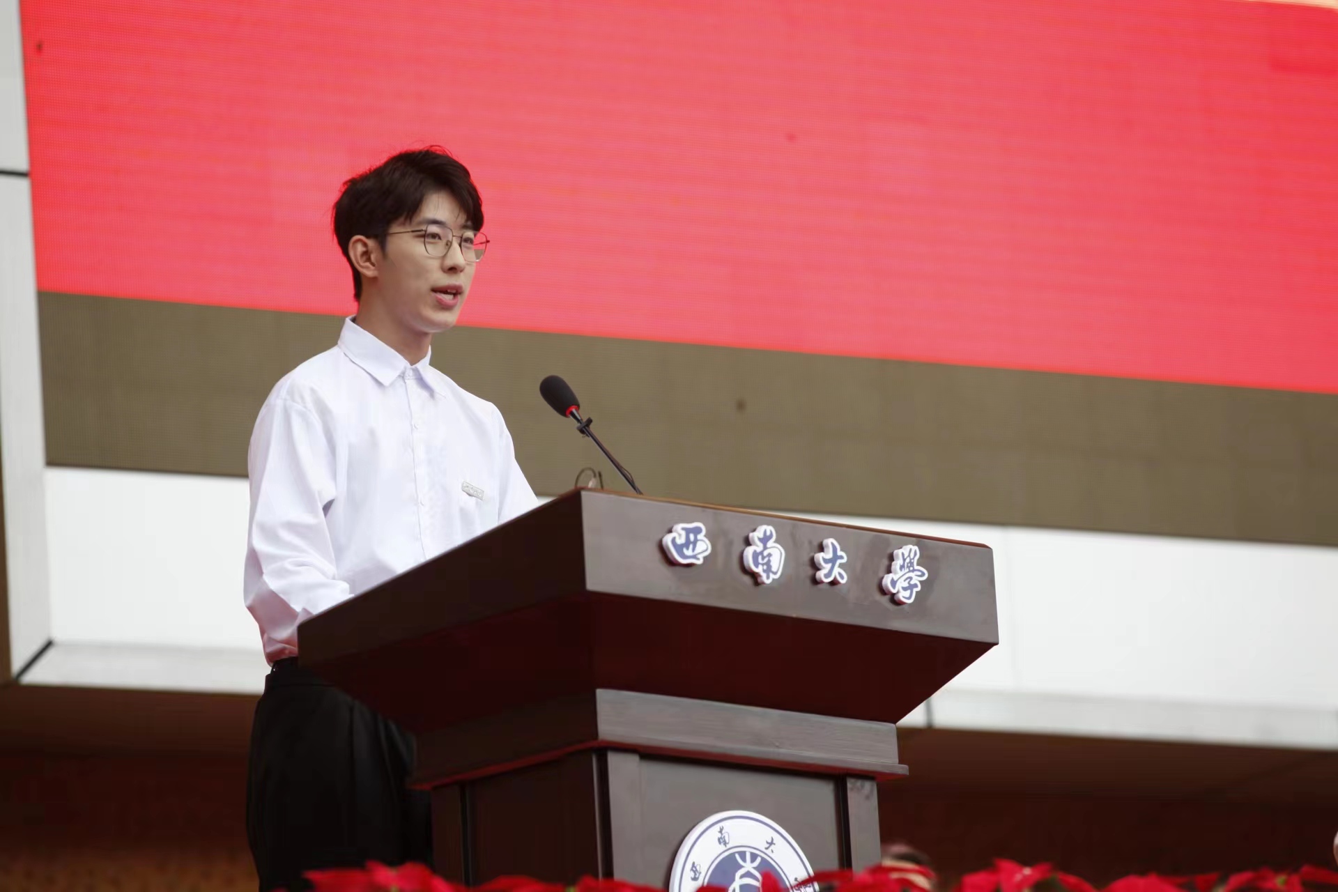 教育学部青年教师赵鑫教授作为教师代表,语重心长地为同学们送上新学期寄语。希望同学们让努力成为一种习惯,做好西大人、成就西大梦、共续西大情,不仅要学会学习、学会研究、学会生活,更要不断增强生命的高度、厚度和温度。期望新生们饱含一份与时代社会同行的家国情怀,铭刻一段不负青春、不负岁月的美好时光,开启一场不枉此生的大学之旅。