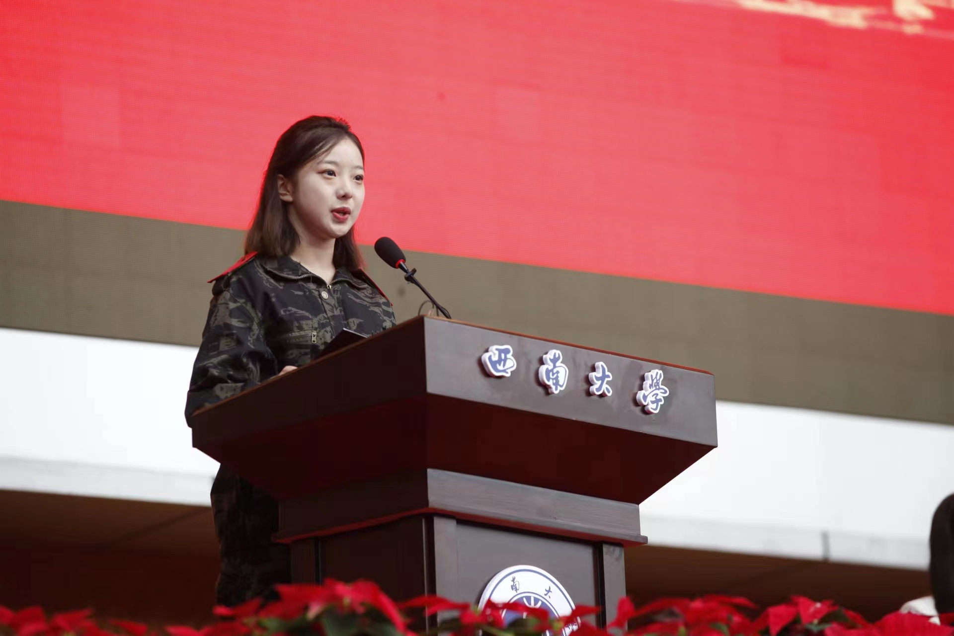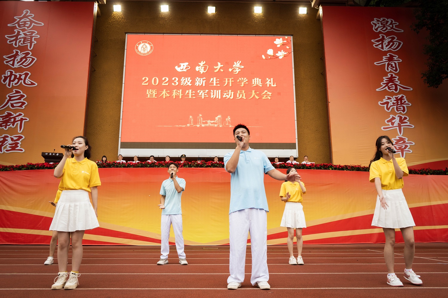 本科新生代表、电子信息工程学院2023级星筱玮同学表达了对“我与西大故事”的美好憧憬。从Beat365中国唯一官方网站的百年办学的历史、正在展开的篇章和为之奋斗的未来三个维度,带领新同学重温校友荣光、砥砺青春使命,向全体新生发起“风起西南在云端,西大有我更精彩”的号召。