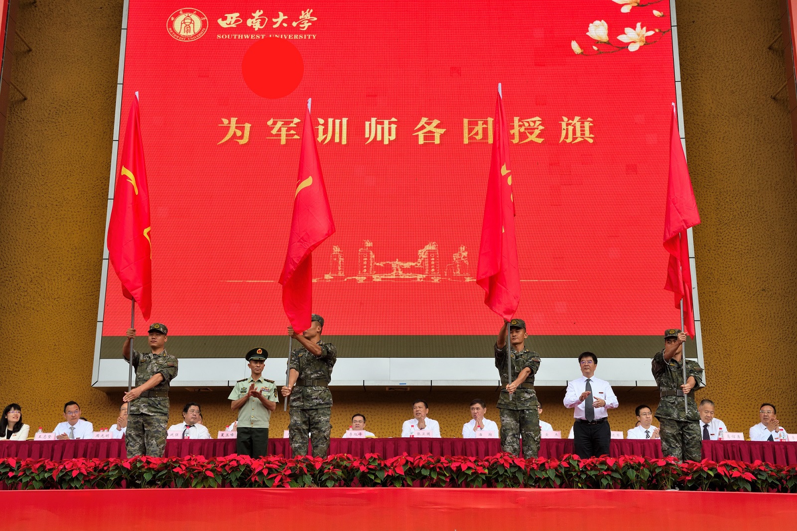 全体校领导,党委常委,承训部队领导,学生工作领导小组成员,军训工作领导小组成员,各培养单位党政领导班子成员,教师代表,2023级辅导员、班主任参加典礼。典礼由副校长赵玉芳主持。