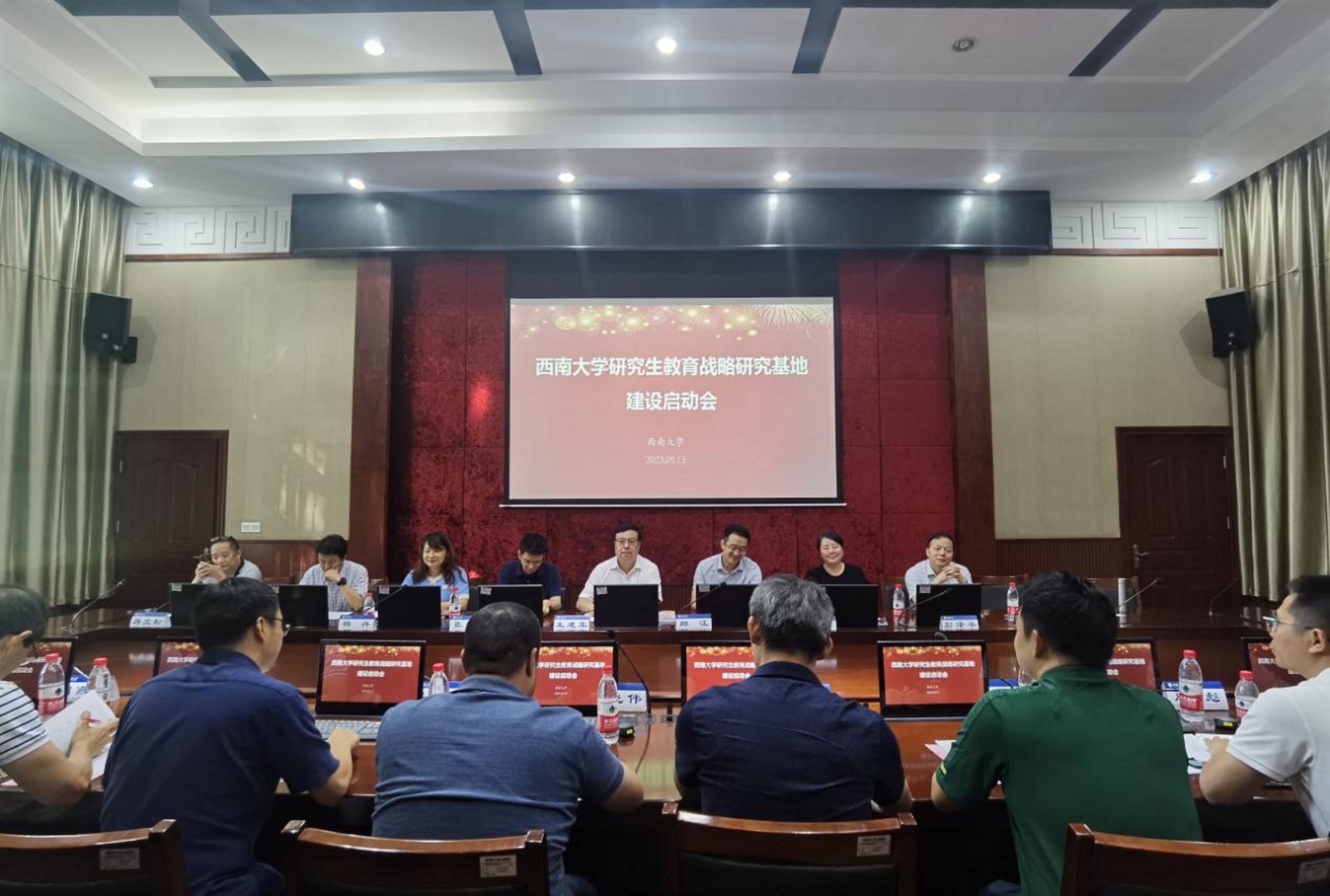 王进军宣读教育部学位管理与研究生教育司《关于支持建设学位管理与研究生教育战略研究基地的函》。基地负责人、校研究生院院长邱江宣读战略研究基地建设领导小组、专家委员会、机构负责人名单。基地重点研究方向负责人、校期刊社社长张陈汇报了战略研究基地建设方案。发展规划与学科建设部、社会科学处、教育学部、教师教育学院、西南民族教育与心理研究中心等单位负责人就研究队伍建设、研究生课程数据库建设、如何服务地方社会发展等内容进行了交流研讨,相关学科专家就基地重点研究领域提出意见建议。