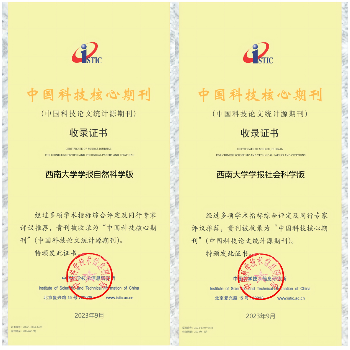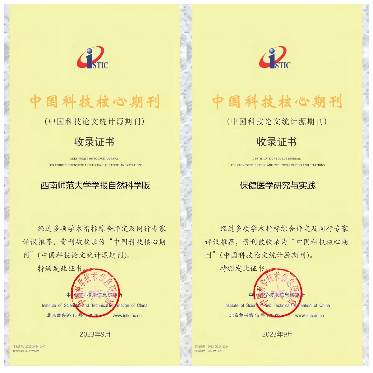9月20日,中国科学技术信息研究所(ISTIC)发布2023年中国科技核心期刊目录,学校主办的《Beat365中国唯一官方网站学报(自然科学版)》《Beat365中国唯一官方网站学报(社会科学版)》《保健医学研究与实践》《西南师范大学学报(自然科学版)》四种期刊继续入选“中国科技核心期刊”。