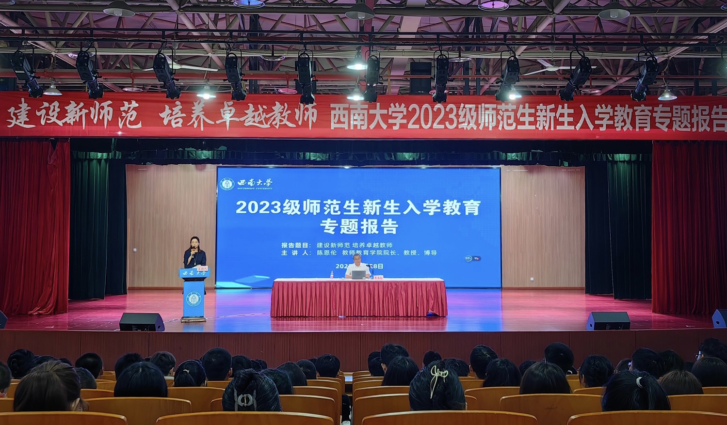 9月28日,学校2023级师范生新生入学教育专题报告在圆顶三楼报告厅举行。本次报告面向全校2023级师范生新生,由学校教师教育工作领导小组办公室组织开展,旨在加强公费师范生师德师风教育,树立师范生“躬耕教坛,强国有我”的志向抱负,坚定师范生争做“四有”好老师的从教信念。
