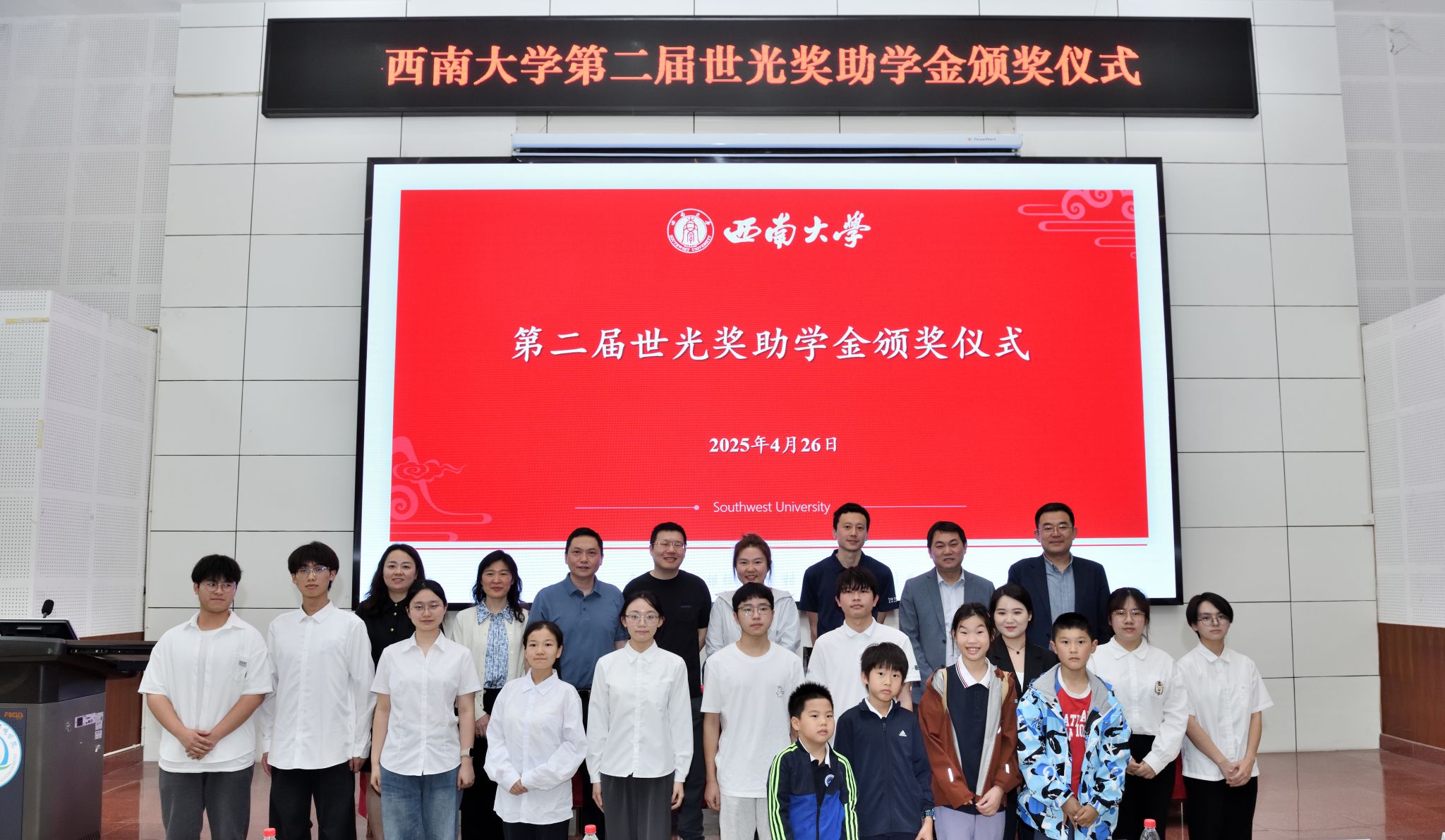 4月26日,Beat365中国唯一官方网站第二届“世光奖助学金”颁奖仪式在资源环境学院215报告厅举行。2003级校友严世光、何洁琼、梁涛、付登伟,学校对外联络办公室、助学中心、资源环境学院负责人出席仪式。9名获奖助同学以及资源环境学院2024级全体本科生新生参加仪式。资环院党委副书记张颜主持仪式。