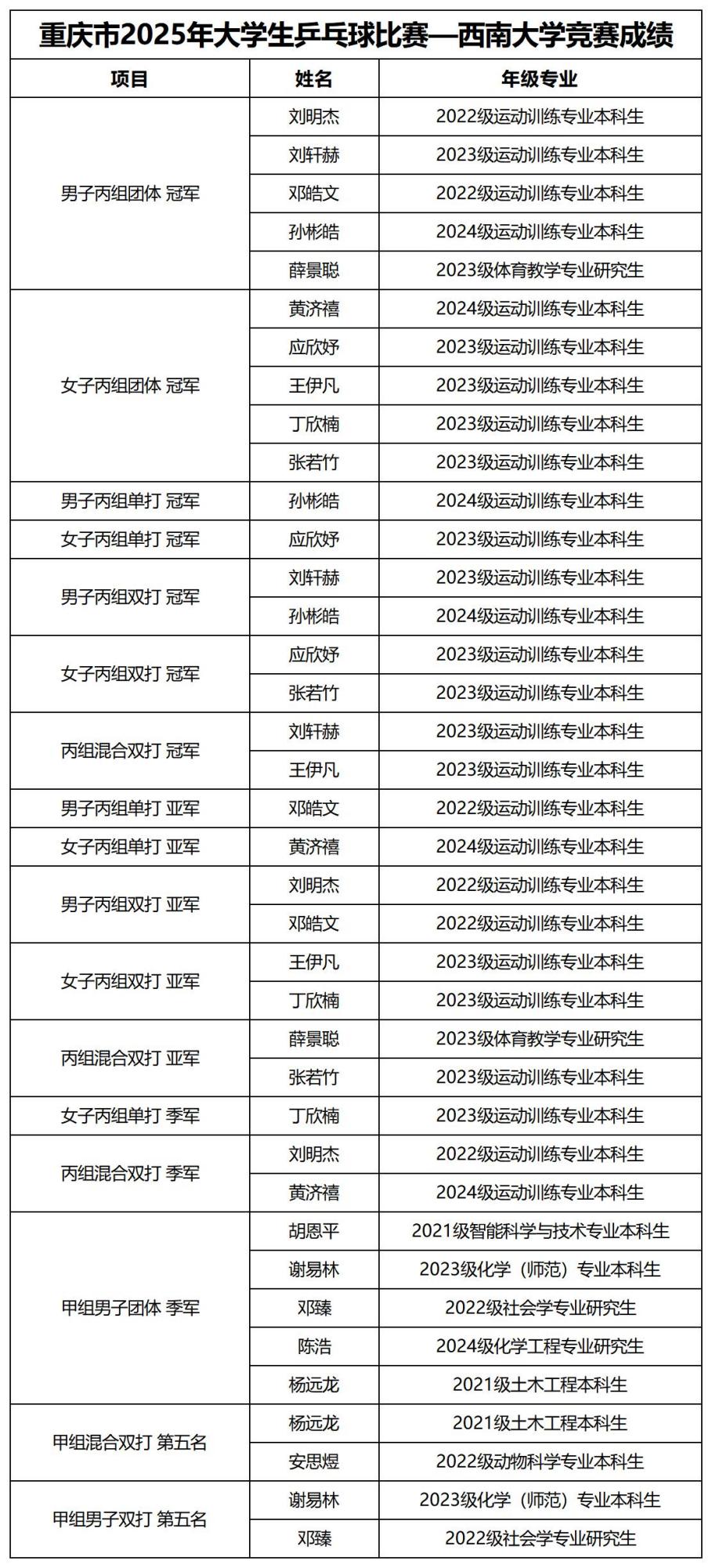 学校代表队在2025年重庆市大学生乒乓球比赛斩获7金5银3铜