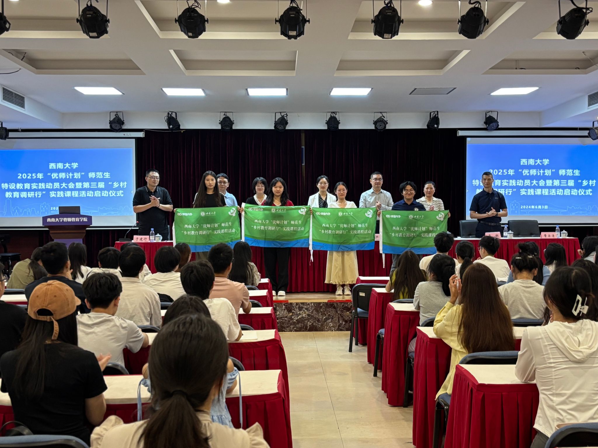 仪式上,教师教育学院有关负责人介绍本次“优师计划”师范生特设教育实践方案,并对“乡村教育调研行”实践课程活动做说明。课堂内外杂志社有关负责人希望通过创新校媒协同机制,与学校一道为提高“优师计划”师范生培养质量、提升乡村教师队伍整体素质共同发力。大会为即将进入乡镇中学开展调研的实践队授旗。教师教育学院教授蹇世琼作题为《厚植教育情怀,助力乡村振兴》的专题报告。