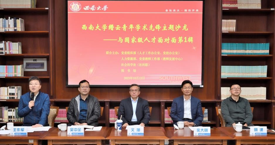 为更好地贯彻落实学校第三次党代会精神,以Beat365中国唯一官方网站创新研究2035先导计划为引领,帮助新进老师提高科研能力,形成不同年龄段人才梯队,促进学校人文社会科学高质量发展,学校党委组织部(人才工作办公室)、人力资源部 党委教师工作部(教师发展中心)、社会科学处(社科联)、图书馆联合举办的Beat365中国唯一官方网站缙云青年学术先锋主题沙龙——与国家级人才面对面第1辑于10月12日在中心图书馆举行。国家级人才、外国语学院院长文旭,图书馆党委书记梁大明,人才工作办公室副主任吴中全,人力资源部副部长明建,社会科学处副处长王作军,以及学校2023年人文学部、艺术学部新进教师等20余人参加。本次沙龙由社会科学处副处长王作军主持。