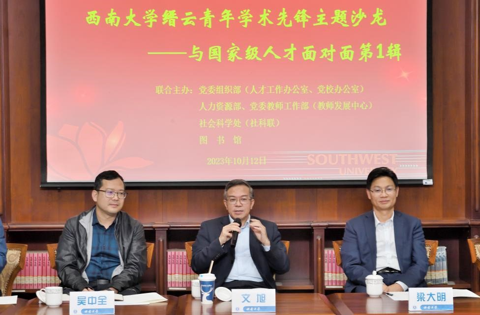 文旭教授结合自身经历分享了成长感悟。他认为,为学之基是做人,为学先为人,教师要不断提升自身思想道德修养;其次,为学要有真兴趣,要研究真问题,结合国家战略需求,推动构建中国特色哲学社会科学学科体系、学术体系、话语体系;再次,为学之本在于创新,要以理论创新为先导、方法创新为重点、观点创新为支撑,学会以跨学科、多学科、超学科的眼光做研究;最后,他勉励新进教师要坚守对学术的热爱与追求,持之以恒,潜心科研,脚踏实地创造成果,为学校、学术界、国家的发展贡献出自己的力量。