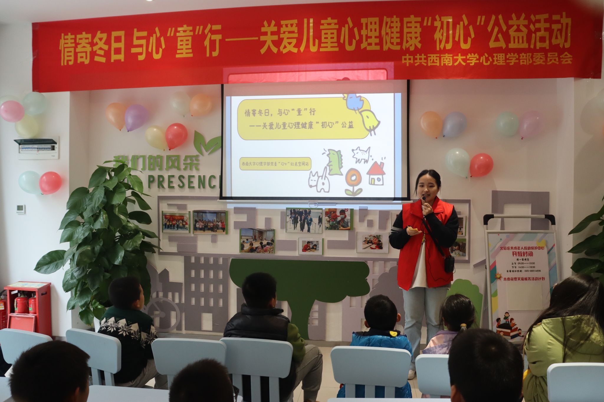 为呵护儿童心理健康,助力健康中国建设,2023年12月2日下午,心理学部党委组织学生赴北碚区未成年人救助保护中心,开展“情寄冬日,与心‘童’行”关爱儿童心理健康“初心”公益活动。学部党委组织员熊丹带领“心+”红色空间站成员、入党积极分子培训班学员及各支部党员代表,为近20名儿童提供心理健康志愿服务。