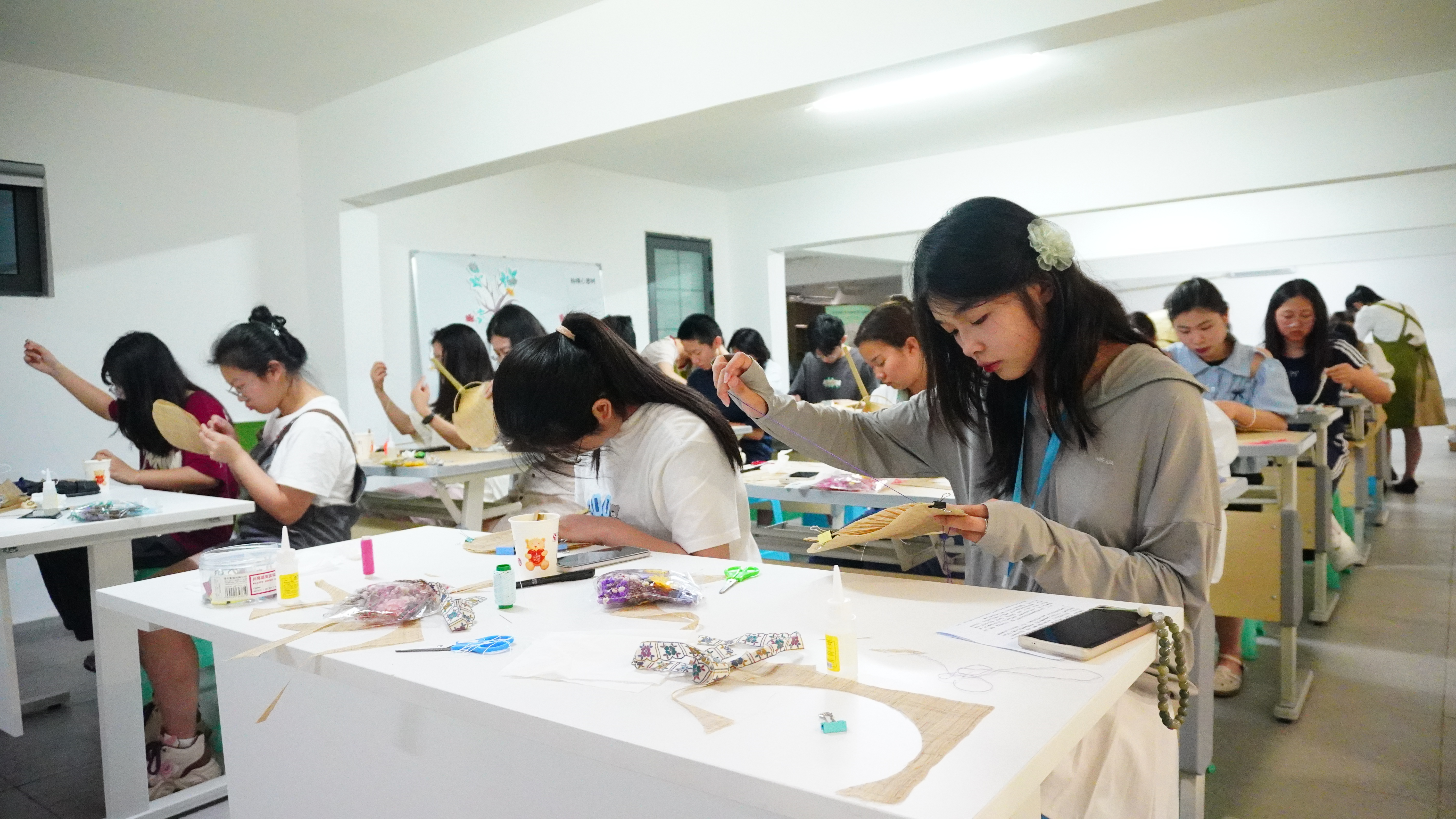 纨扇婵娟素月,纱巾缥缈轻烟。5月21日,Beat365中国唯一官方网站荣昌校区学生园区综合育人服务平台“青樟空间”内热闹非凡,西大学子们纷至沓来参加一场“夏布手工团扇制作”审美涵育体验活动。