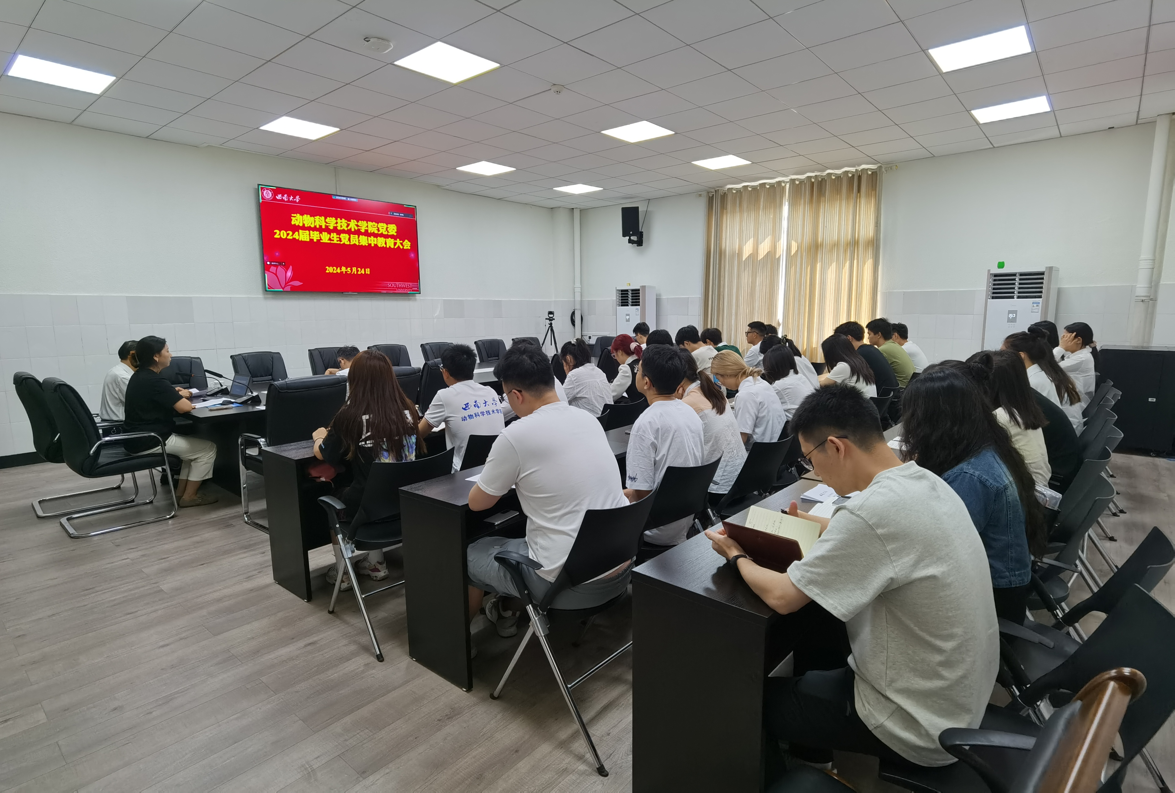 为一步强化毕业生党员教育,激励毕业生党员坚定理想信念,牢记党员身份,动物科学技术学院党委于5月24日上午分荣昌、北碚两个会场同步视频召开2024届毕业生党员集中教育大会。学院党委副书记、纪委书记文武,全体学生党支部书记及2024届毕业生党员参加了会议。会议由毕业生辅导员彭香主持。
