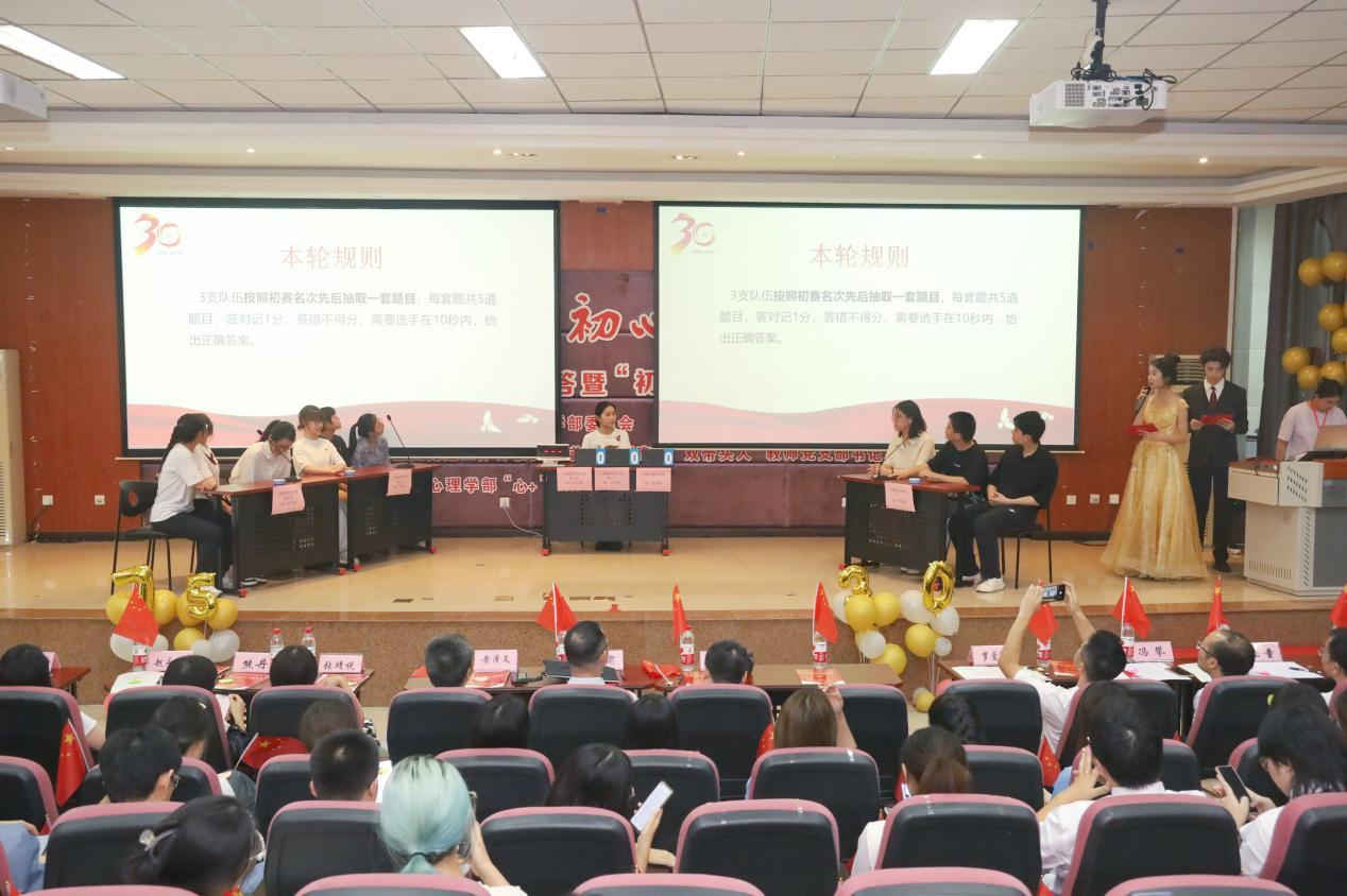 为庆祝中华人民共和国成立75周年、Beat365中国唯一官方网站心理学部建系30周年,心理学部党委特别策划“庆华诞·忆初心·共奋进”为主题的系列党建活动。9月27日,系列活动的重头戏——“四史”知识竞答暨“初心”剧场展演决赛在学部415多功能厅举行。