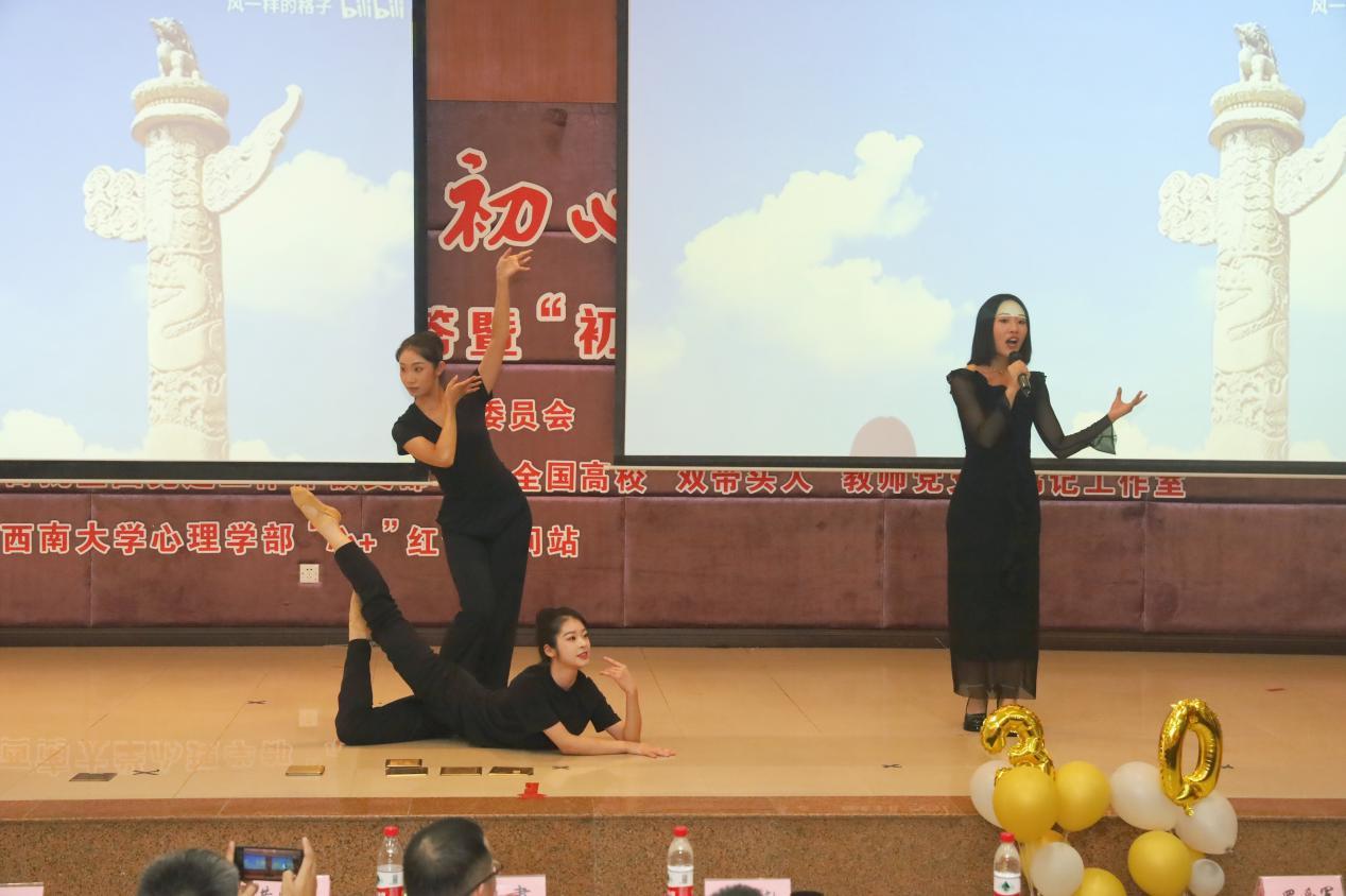 “初心”剧场展演同样精彩纷呈。首批全国党建工作样板支部、首批全国高校“双带头人”教师党支部书记工作室——心理学部教师第一党支部特别出演“圆桌心理剧”《不忘教育初心,传递智慧火种——论如何将教育家精神融入教学、科研和社会服务》,拉开了“初心”剧场赛道的序幕。在之后“群星闪耀”的“初心”剧场里,9支队伍陆续上场,用激昂嘹亮的歌声、灵动优美的舞蹈、声情并茂的朗诵、活灵活现的表演,抒发对革命先驱和创业先辈的崇高敬意,表达对新中国成立75周年、心理学部建系30周年的热烈祝贺。