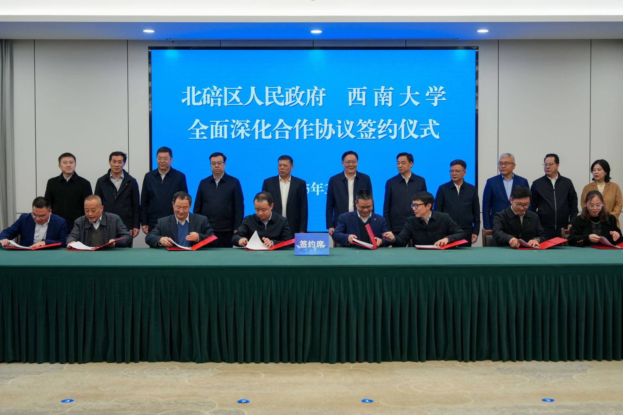 为推动校地合作提质升级,3月28日下午,学校与北碚区人民政府全面深化合作协议签约仪式在北碚区行政中心举行。北碚区委书记林旭阳,区委副书记、区长卓大林,区人大常委会主任徐永德,区政协主席董伦,区委常委、组织部部长梅玉军,区政府副区长向红;学校党委书记张卫国,校长王进军,党委副书记武好明,副校长白显良、范大明等领导出席签约仪式。